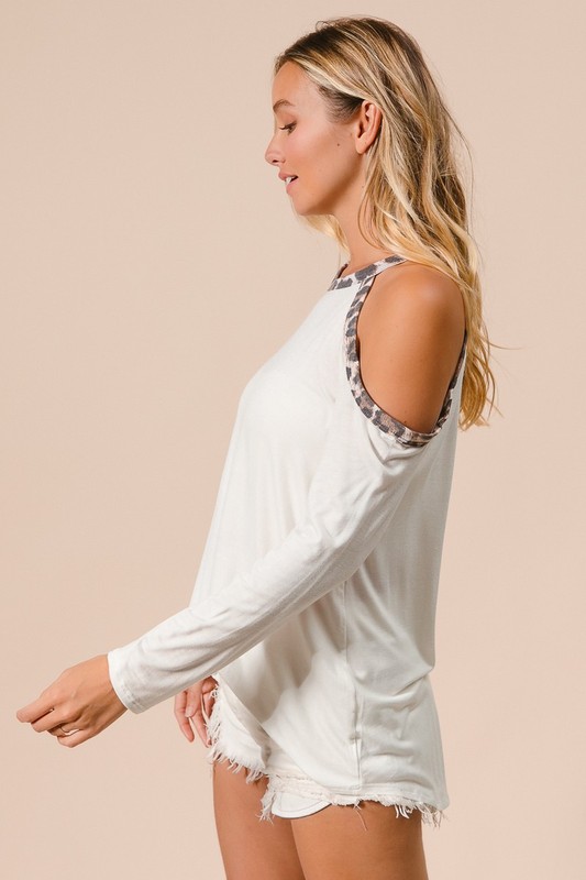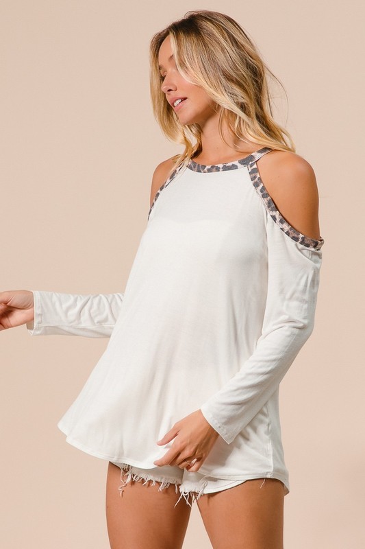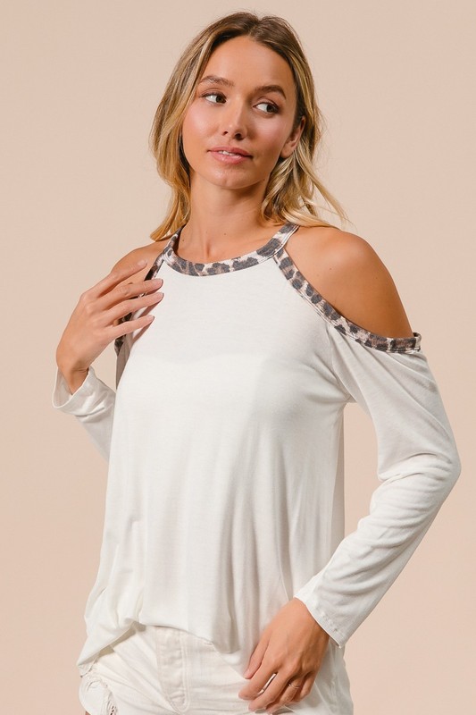 The Jersey Knit Cold Shoulder Top With Leopard Neck is a stylish garment made of jersey knit fabric, featuring a cold shoulder design and a leopard print neckline. This top combines fashion and comfort, with the cold shoulder design adding a trendy touch and the leopard print neckline adding a pop of interest. Pair it with jeans or a skirt to create a chic and casual look.