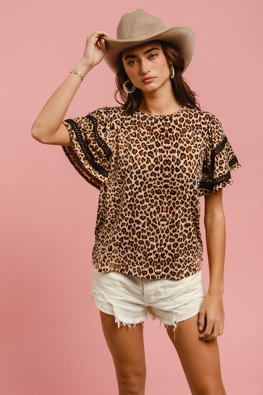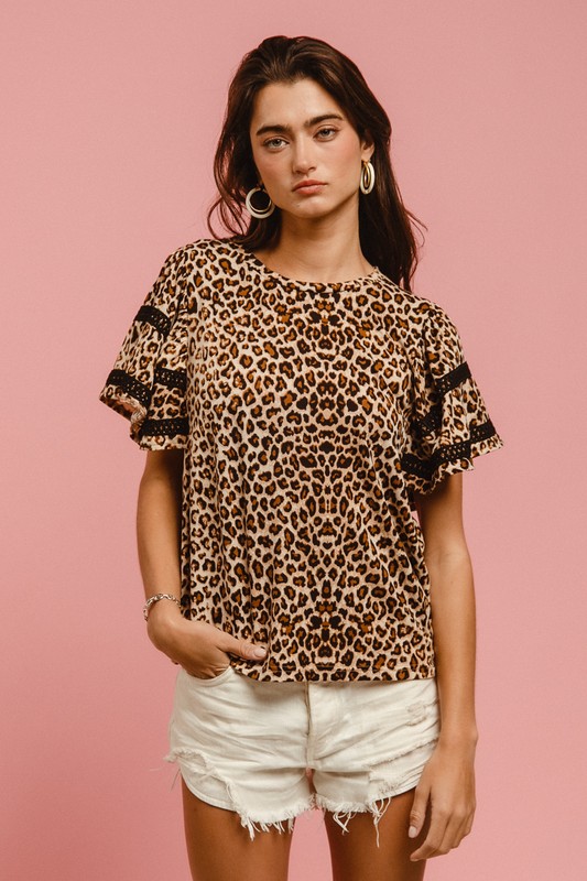 The Leopard Crochet Trim Round Neck Short Sleeve Top is a chic and playful garment. The leopard print adds a bold and stylish touch to the top. The crochet trim detailing provides a feminine and intricate accent. With a round neck and short sleeves, it offers a classic and versatile style. This top is perfect for adding a trendy and eye-catching element to your outfit, suitable for both casual and dressed-up occasions.