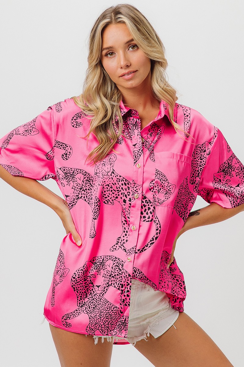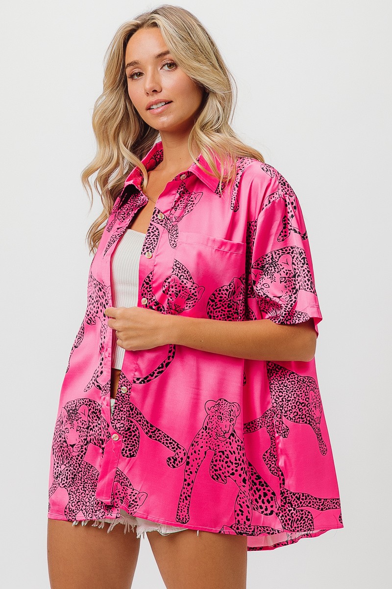 This silky satin shirt top features a bold and stylish leopard print design for a chic and trendy look. The short sleeves add a casual and breezy feel to the top. Perfect for adding a touch of sophistication and glamour to your outfit, this top can be dressed up with tailored pants or dressed down with jeans for a versatile and fashion-forward ensemble.
