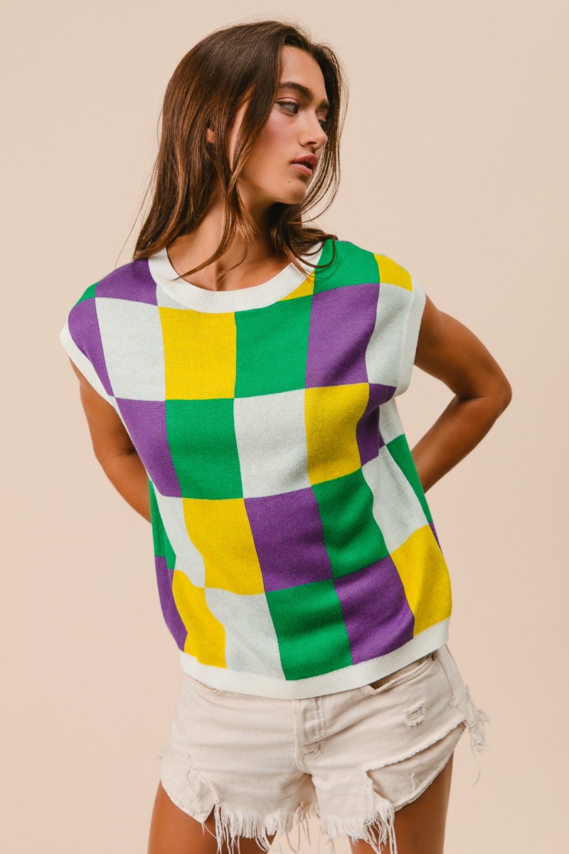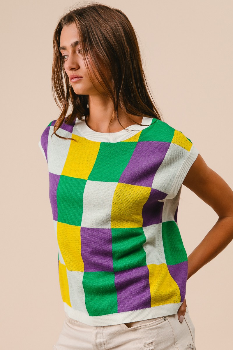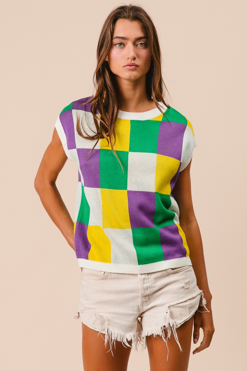 This sleeveless sweater top showcases a stylish Mardi Gras checker pattern, perfect for adding a festive touch to your wardrobe. The checker pattern captures the lively and colorful spirit of Mardi Gras celebrations. With its sleeveless design, this top is versatile for layering or wearing on its own. The unique checker pattern adds a modern and chic twist to a classic sweater style. Embrace the Mardi Gras festivities in style with this trendy and eye-catching sleeveless sweater top.