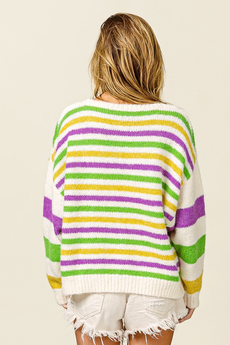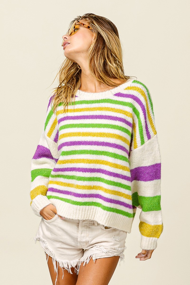 This comfy sweater features vibrant Mardi Gras colors in a stylish and eye-catching stripe pattern. The design captures the festive spirit of Mardi Gras celebrations. With a cozy and comfortable feel, this sweater is perfect for casual yet chic looks. The bold colors and stripes make a statement, adding a pop of color to your wardrobe. Stay cozy and stylish while embracing the fun and lively spirit of Mardi Gras with this unique sweater.