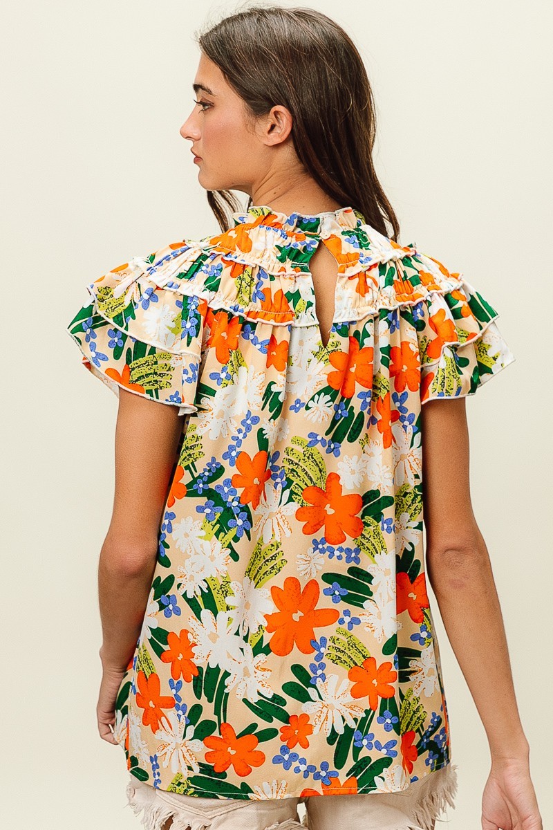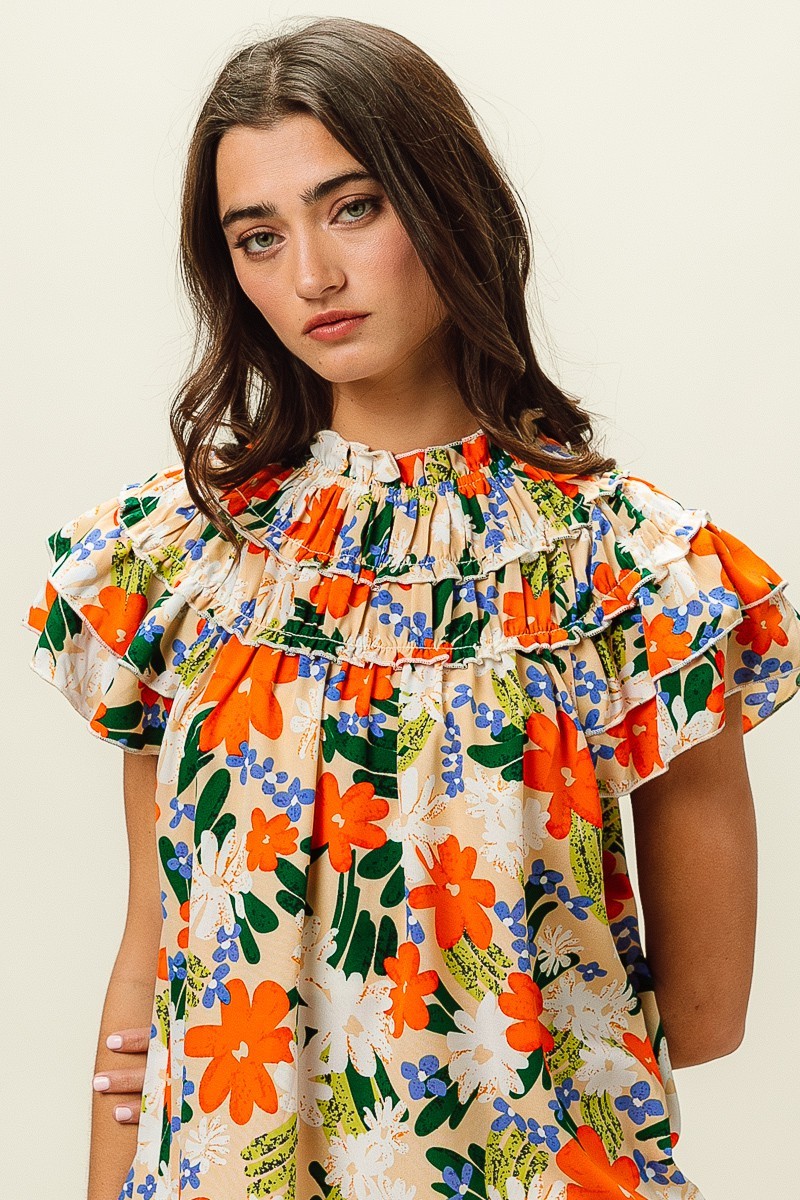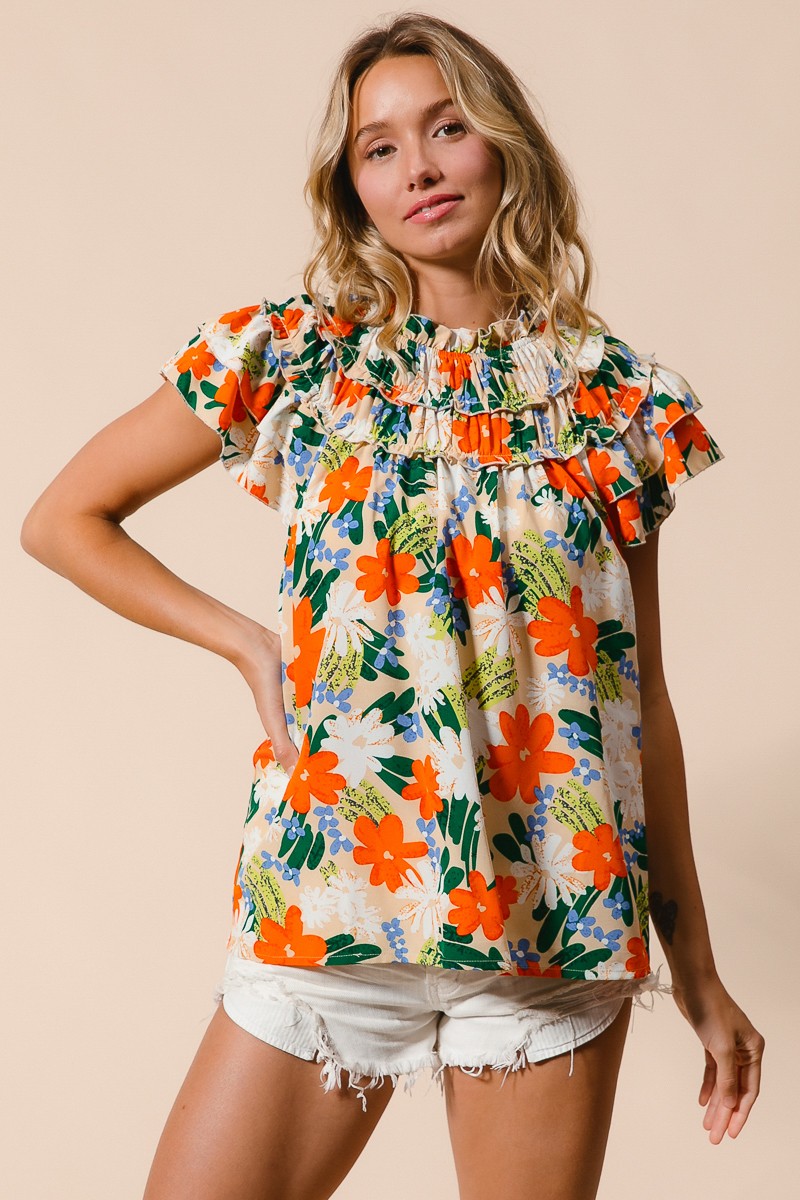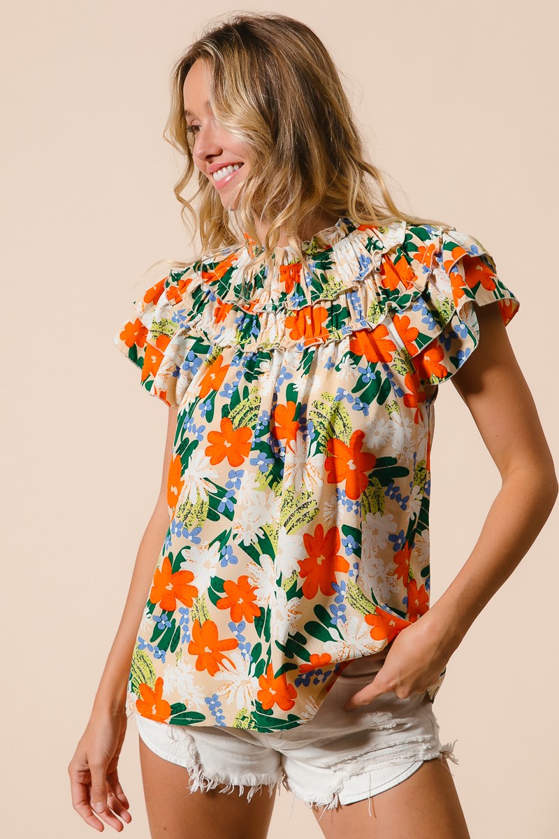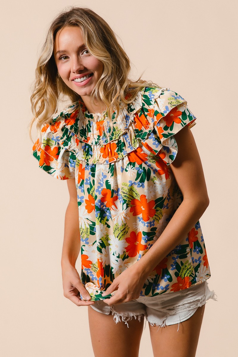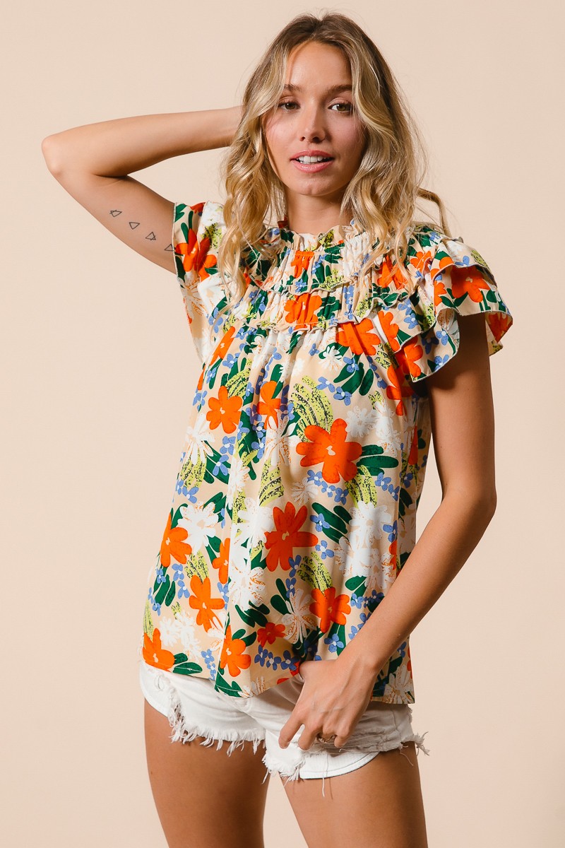 This woven top showcases a vibrant multi-color floral print, adding a cheerful and stylish touch to your outfit. The floral pattern brings a pop of color and a whimsical flair to the design. Perfect for adding a feminine and summery vibe to your look, this top can be paired with jeans, shorts, or skirts for a fresh and fashionable ensemble.