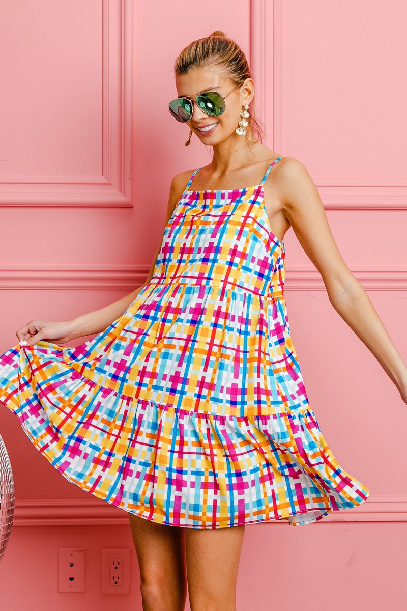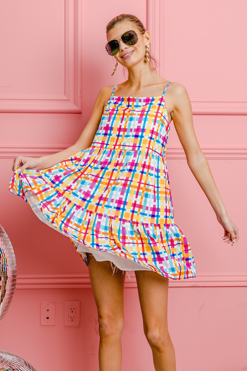The multi-colors plaid sleeveless sundress is a cheerful and versatile piece that exudes a fun and playful vibe. Featuring a plaid pattern in various colors, this dress offers a fresh and vibrant look for sunny days. The sleeveless design is perfect for staying cool and comfortable in warm weather. You can style this dress with sandals or sneakers for a casual daytime outfit. Whether you're heading to a picnic, brunch, or a day out in the sun, this sundress is a charming and easy-to-wear choice that adds a pop of color to your summer wardrobe.