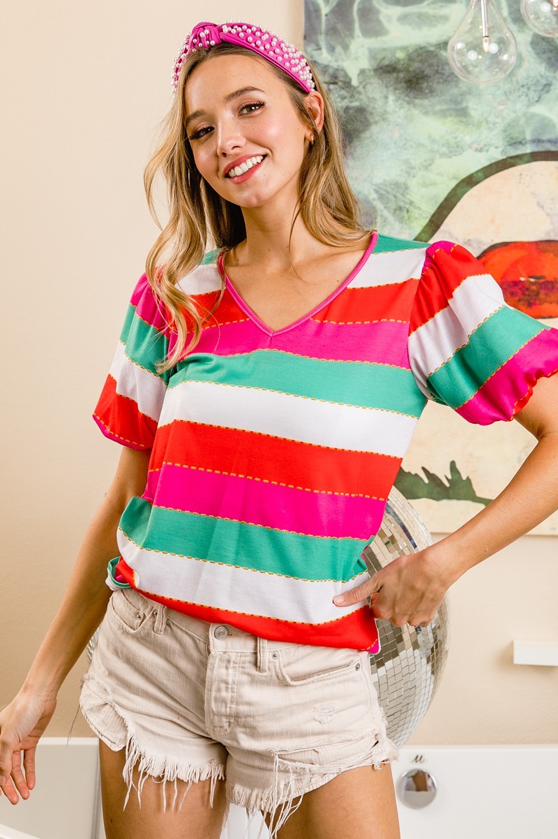 The Multi-Stripe Color Print Puff Sleeves V-Neck Top is a vibrant and stylish garment that showcases a mix of colorful stripes in a unique print. The puff sleeves add a touch of volume and drama to the design, while the V-neckline offers a flattering and feminine look. Perfect for adding a pop of color and a playful vibe to your outfit, this top can be paired with jeans, shorts, or skirts for a fashion-forward ensemble.