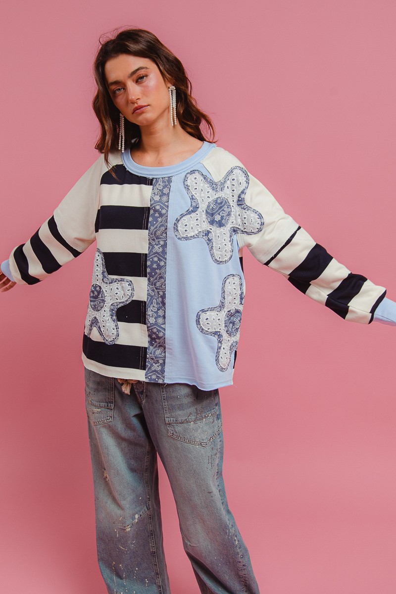 The Patchwork Sweatshirt Top is a trendy and unique piece that adds a modern twist to your casual wardrobe. The patchwork design gives it a cool and edgy vibe. With a comfortable sweatshirt material, this top is perfect for cozy and relaxed days. Pair it with your favorite jeans or leggings for a stylish and effortless look. Elevate your streetwear style with this eye-catching patchwork sweatshirt top.