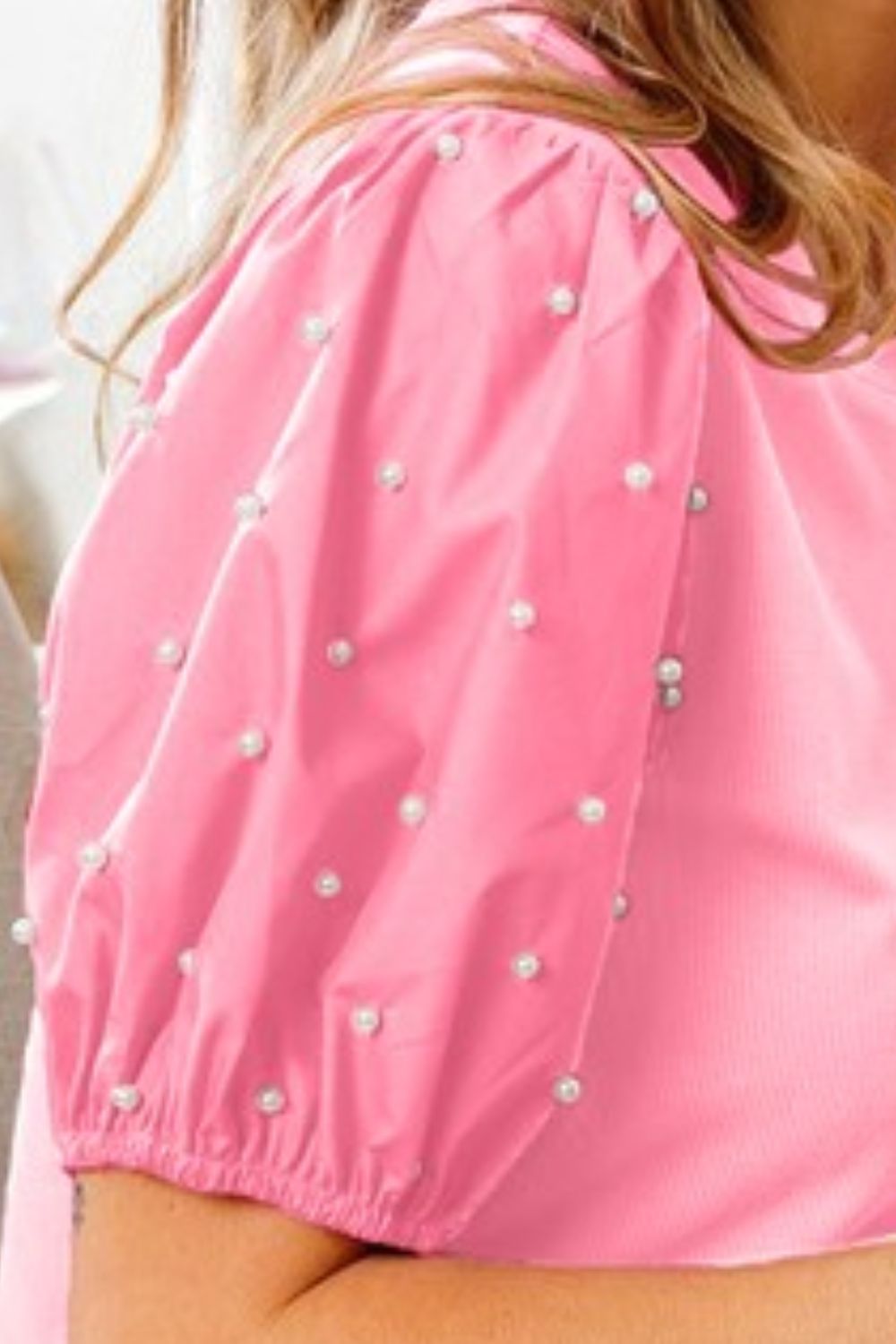BiBi Pearl Beaded Short Puff Sleeve Top