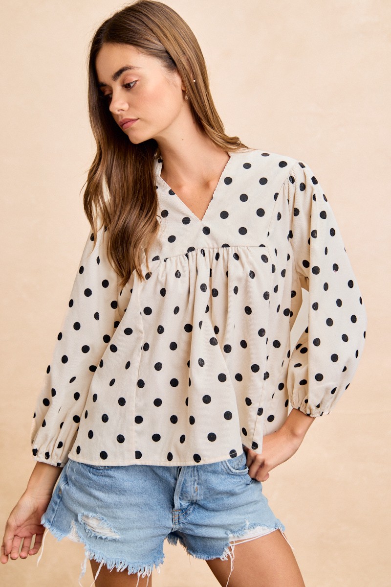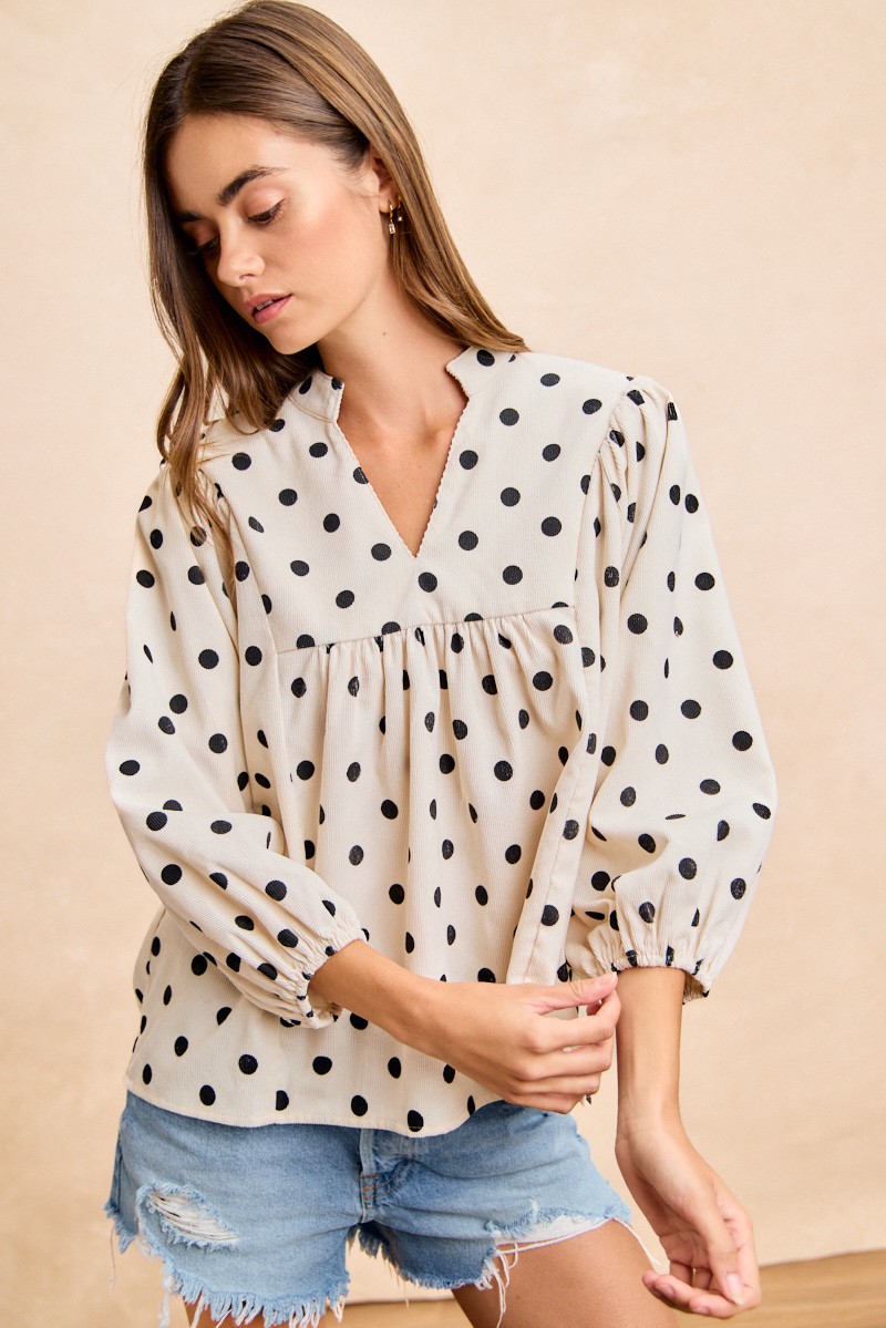 The Polka Dot Corduroy Quarter Sleeves V Neck Top is a trendy and retro-inspired piece for your wardrobe. With its polka dot pattern and corduroy fabric, this top offers a unique and stylish look. The quarter sleeves add a touch of vintage charm to the V-neck style. Perfect for pairing with high-waisted bottoms, this top is versatile for both casual and dressy occasions. Elevate your outfit with the playful and chic Polka Dot Corduroy Quarter Sleeves V Neck Top for a fun and fashionable ensemble.