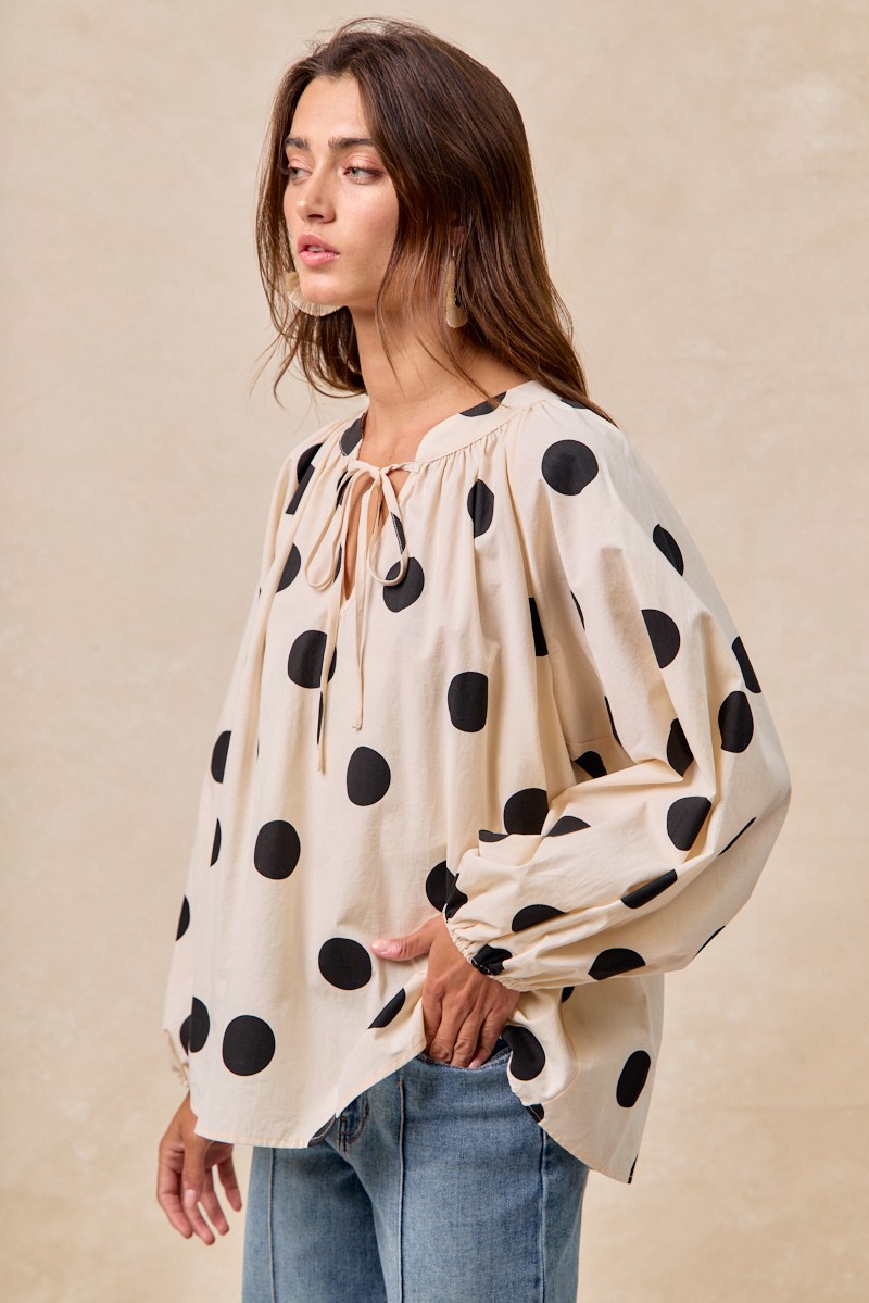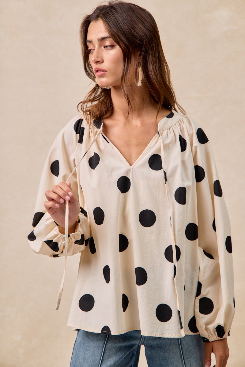 This polka dot blouse features exaggerated balloon sleeves for a dramatic and fashion-forward look. The playful polka dot print adds a whimsical touch to the blouse. The exaggerated balloon sleeves make a statement and add volume to the overall silhouette. Perfect for adding a touch of fun and flair to your outfit, this blouse is a versatile piece that can be dressed up or down. Elevate your style with this trendy blouse that combines bold sleeves with a classic print.