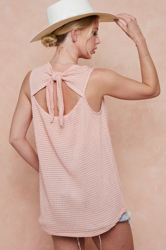 This popcorn waffle open back top with a tied ribbon is a stylish and unique piece for your wardrobe. The popcorn waffle texture adds a playful and tactile element to the top. The open back design provides a touch of allure, while the tied ribbon adds a feminine and elegant detail. Pair this top with high-waisted pants or a skirt to showcase the open back feature. Make a fashion statement with this chic popcorn waffle open back top with a tied ribbon.