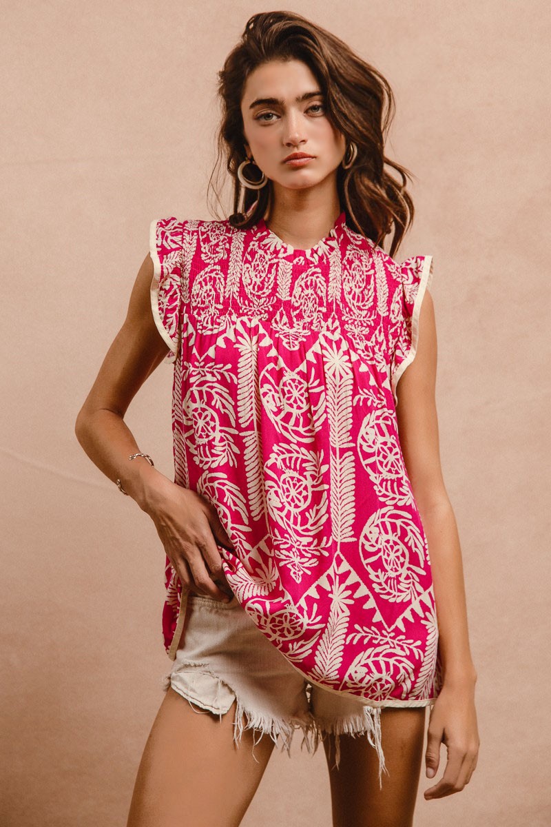 This stunning sleeveless blouse features a vibrant pink paisley print that creates a bold and feminine statement. Crafted from lightweight, breathable fabric with a comfortable relaxed fit, it showcases decorative ruffle cap sleeves and a gathered round neckline for added charm. The intricate paisley pattern in contrasting pink and white tones offers versatile styling options, perfect for casual outings or dressed-up occasions. The bohemian-inspired design combines comfort with contemporary fashion trends, making it an essential wardrobe piece for modern women seeking both style and comfort.