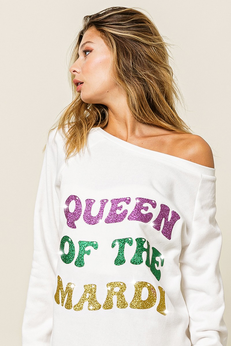 The "Queen of Mardi" glitter print Mardi Gras sweatshirt is a festive and eye-catching addition to your wardrobe. Featuring a bold glitter print design, it adds a touch of sparkle and glamour to your Mardi Gras celebrations. The sweatshirt is comfortable to wear with its cozy material and relaxed fit, perfect for all-day wear during the festivities. Whether you're attending parades or parties, this sweatshirt is sure to make a statement. Embrace the spirit of Mardi Gras in style with this fun and vibrant sweatshirt.