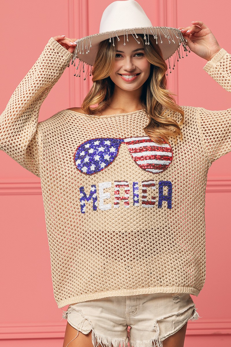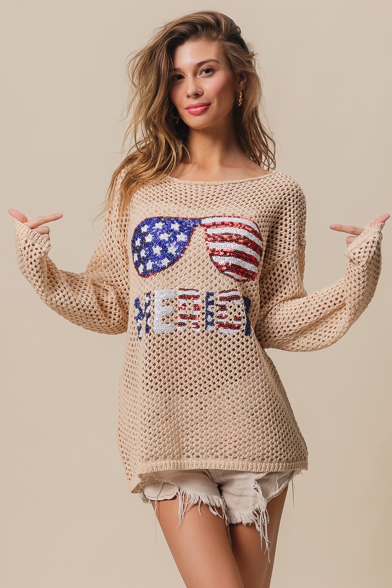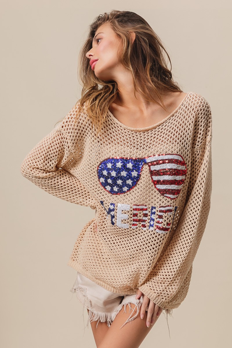 The Sequin American Flag Sunglasses Knit Cover Up is a unique and festive piece that combines sequins, American flag design, sunglasses, and a knit cover-up. This eye-catching garment is perfect for adding a touch of fun and patriotism to your beach or poolside look. The sequin detailing adds a playful shimmer to the American flag motif, while the knit cover-up provides a lightweight and stylish layer for sunny days. Pair it with your favorite swimsuit and sandals for a statement-making ensemble that embodies a playful, summer vibe.