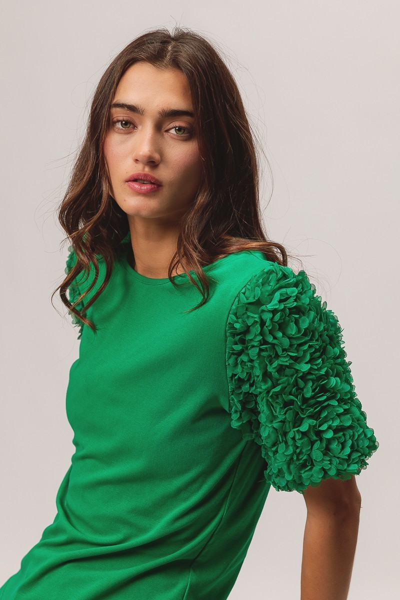 This knit top features short mesh flower sleeves, adding a feminine and elegant touch to the design. The mesh flower detailing creates a stylish and eye-catching look. Made with comfortable knit fabric, this top is perfect for a chic and versatile outfit. Elevate your wardrobe with this trendy short mesh flower sleeve knit top!