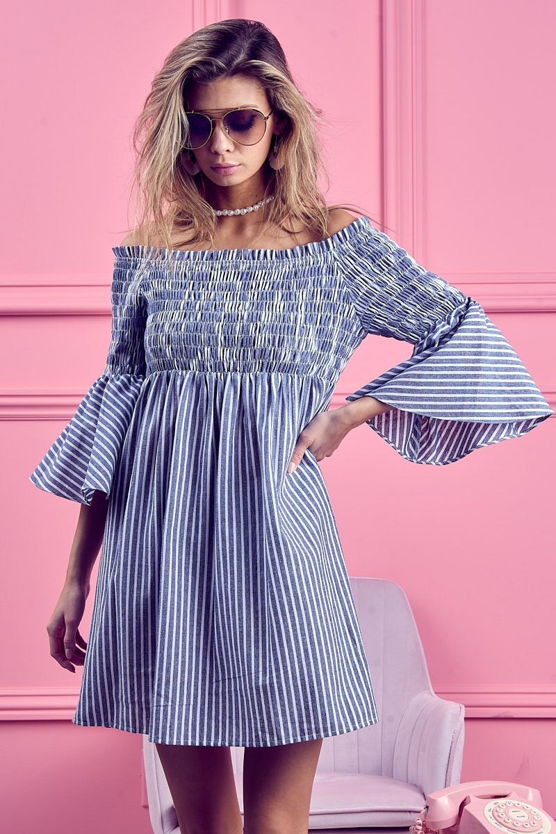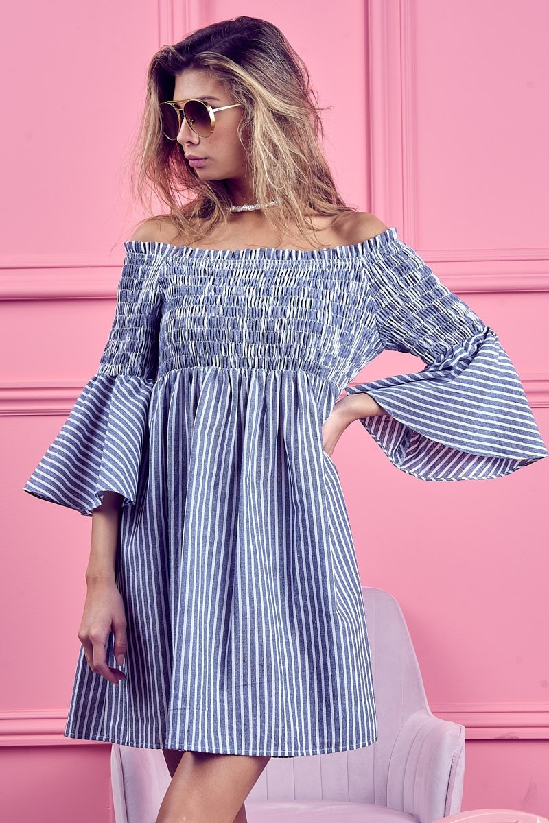 The Smocked Off-Shoulder Striped Dress is a charming and feminine piece featuring a flattering off-shoulder neckline and a sweet striped design. The smocked detailing offers a fitted and comfortable silhouette that complements the playful and summery vibe of the dress. Perfect for showcasing your shoulders and creating a breezy and stylish look for warm weather outings or casual occasions.