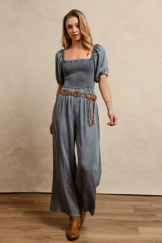 This denim jumpsuit boasts a smocked washed design with charming puff sleeves and a flattering square neckline for a fashionable twist on a classic piece. The comfortable denim fabric makes it suitable for all-day wear, while the stylish details add a trendy touch to your outfit. Elevate your casual look with this chic and versatile denim jumpsuit that seamlessly combines comfort and style.