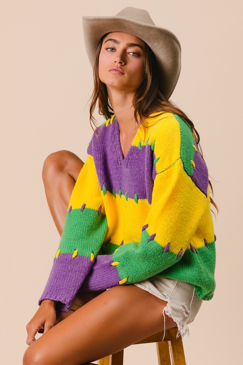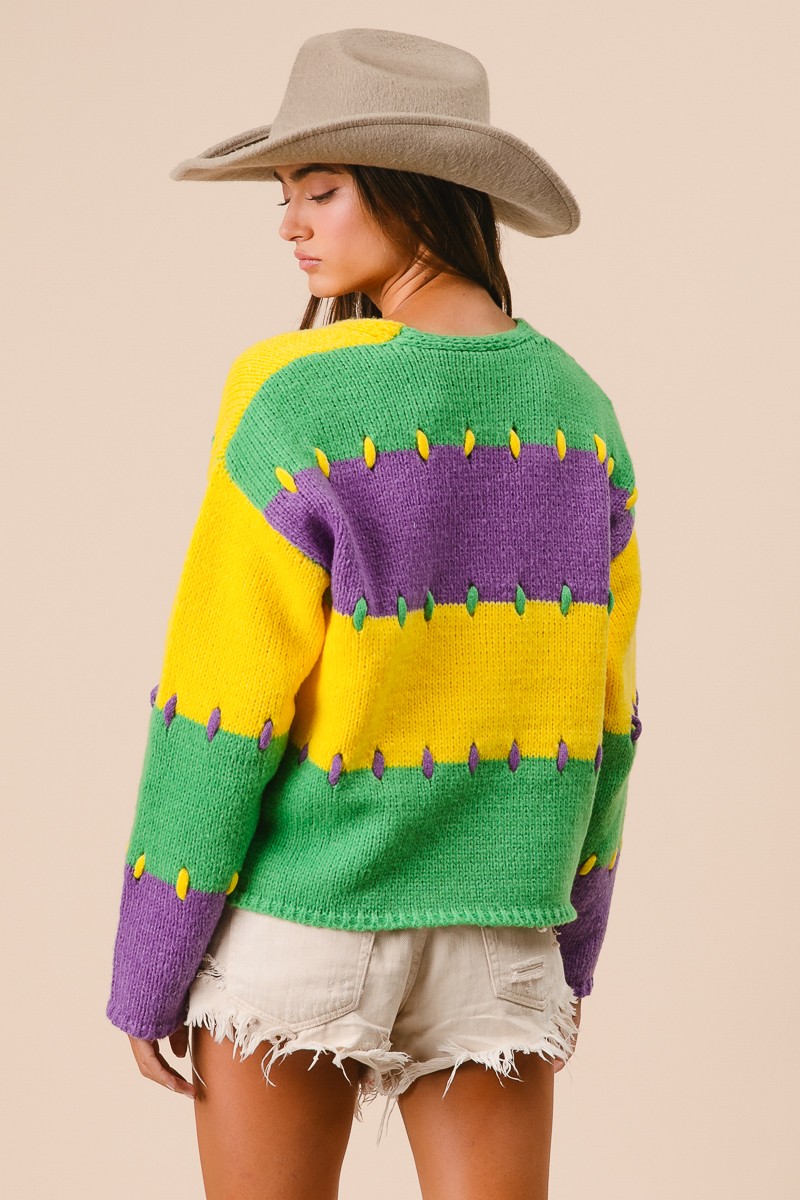 Stay festive and cozy in this Stitch Detail Mardi Gras Stripes Sweater, perfect for celebrating in style. The Mardi Gras stripes add a playful and colorful touch to the classic sweater design. Featuring intricate stitch details, this sweater exudes craftsmanship and quality. Whether you're attending a Mardi Gras event or simply want to add some flair to your outfit, this sweater is a versatile choice. Elevate your winter wardrobe with this fun and eye-catching Mardi Gras-themed sweater.