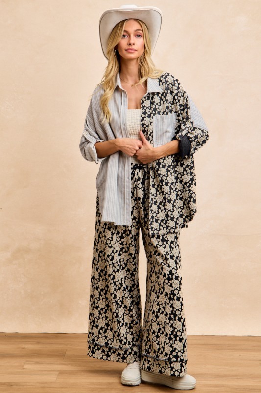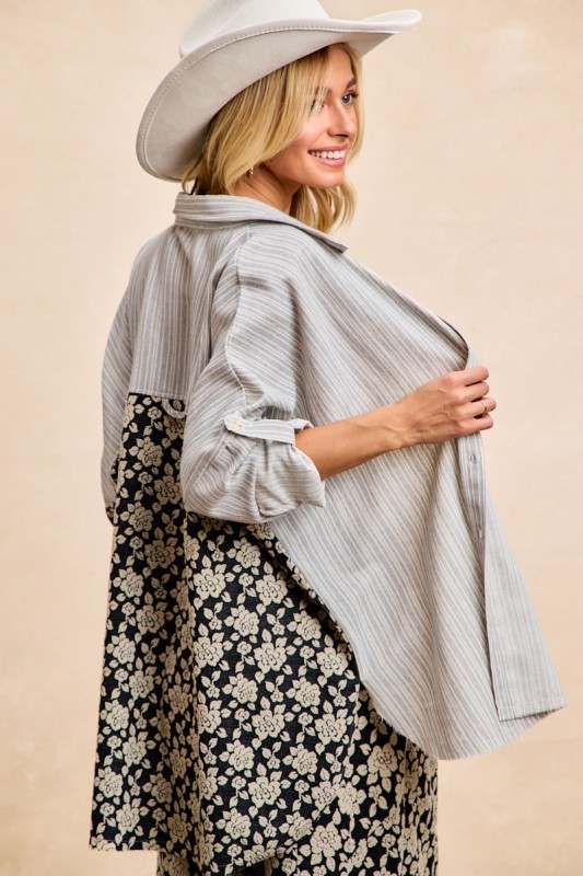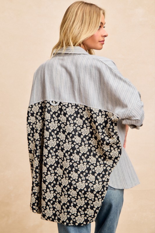 This stripes jacquard floral mix and match shirt top combines classic stripes with elegant floral jacquard, featuring a unique mixed pattern design for a chic and trendy look. Made with soft and breathable fabric, it offers all-day comfort and pairs easily with various bottoms for versatile styling.