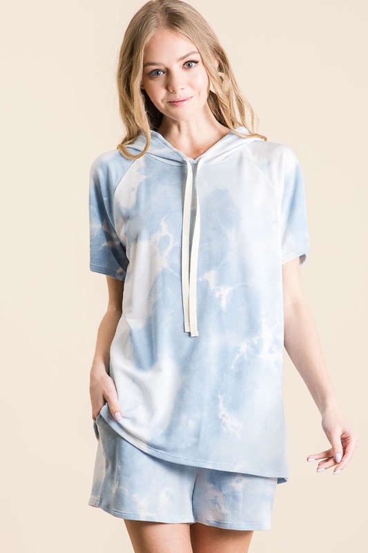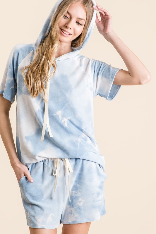 This matching set features a cozy French terry hoodie top and bottom with a trendy tie-dye pattern. The hoodie offers a relaxed fit and the bottoms provide comfort for lounging or casual outings. Ideal for a coordinated and stylish look, this set is perfect for adding a touch of fun and comfort to your wardrobe.