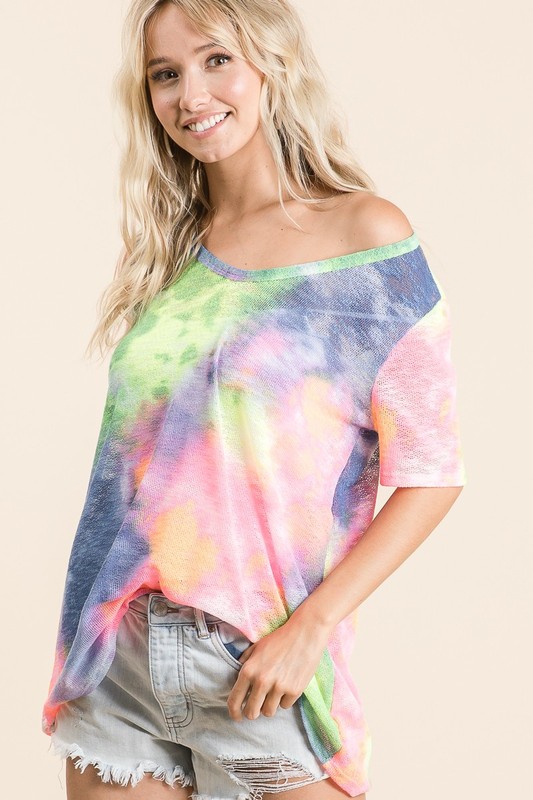 This Tie Dye Print Low Gauge Deep U Neck Top features a stunning and trendy tie-dye pattern. The deep U-neck adds a stylish and flattering touch to the look. Made with a low gauge fabric, it offers a lightweight and comfortable feel. Perfect for a casual and chic day out, this top is sure to make a statement. Embrace the tie-dye trend with this effortlessly stylish piece.