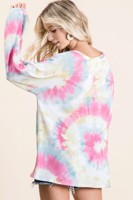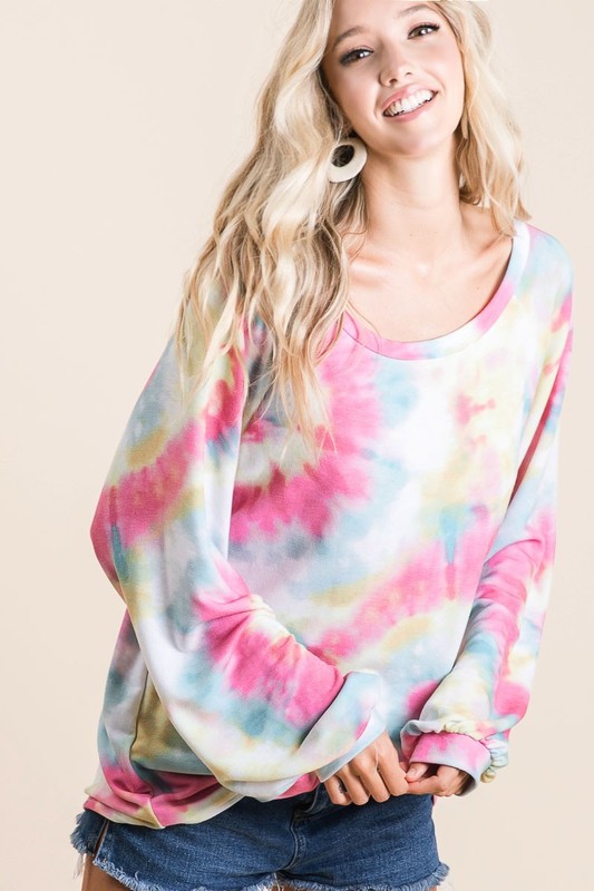 BiBi Tie Dye Print Terry Top With Puff Sleeves