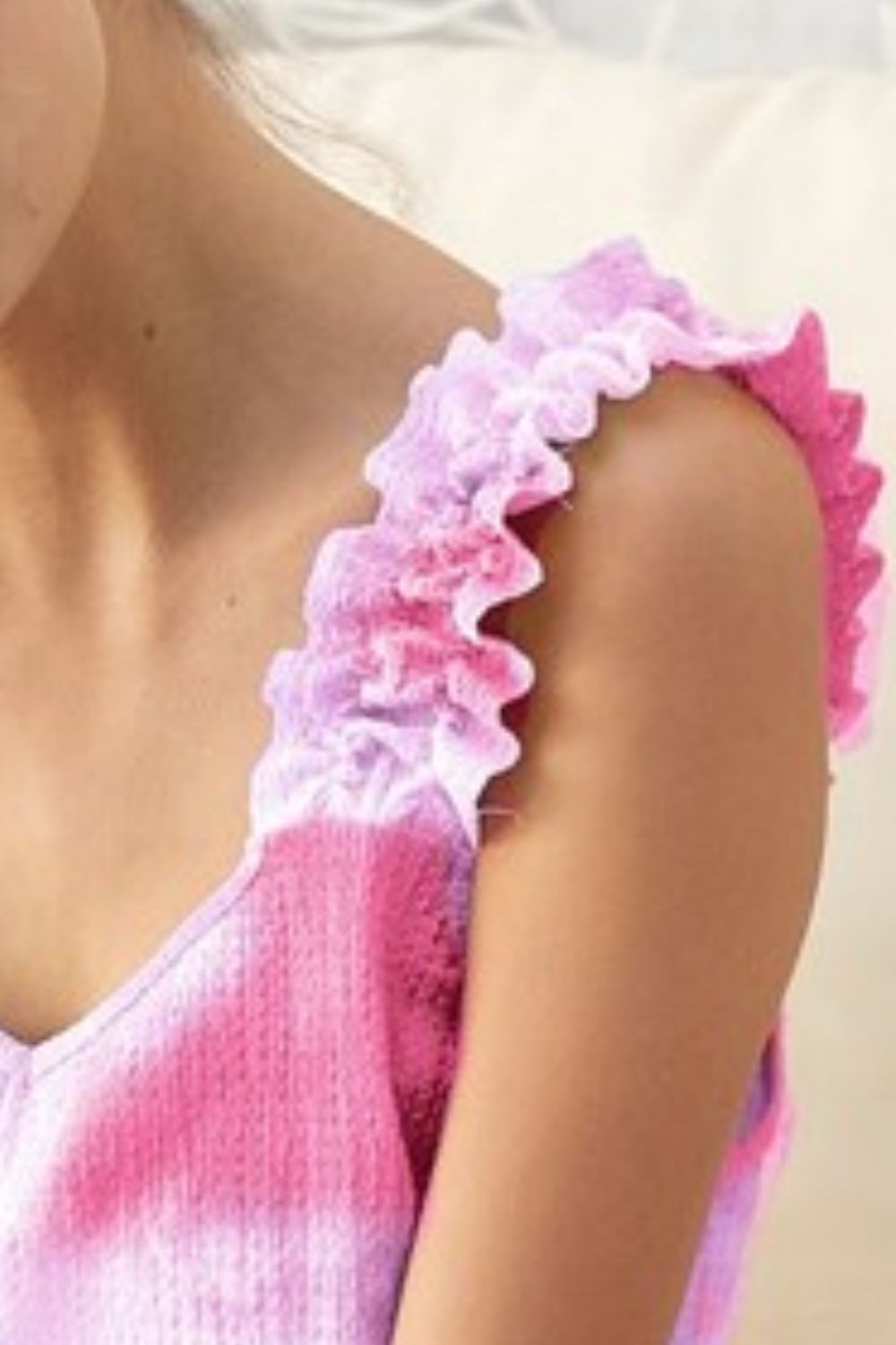 This textured woven top features a trendy tie-dye print and charming ruffled details for a bohemian-inspired look. The tie-dye print adds a fun and unique touch to the top, making it a stylish statement piece. With delicate ruffled accents, this top exudes a feminine and playful vibe that is perfect for a casual yet trendy outfit. Made with high-quality textured fabric, it offers both style and comfort for all-day wear. Elevate your wardrobe with this chic and fashionable top that effortlessly combines texture, print, and a touch of whimsy.