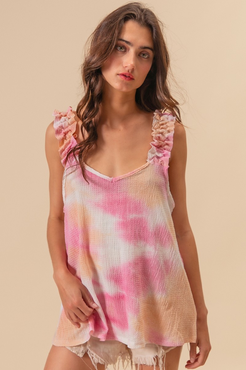 This textured woven top features a trendy tie-dye print and charming ruffled details for a bohemian-inspired look. The tie-dye print adds a fun and unique touch to the top, making it a stylish statement piece. With delicate ruffled accents, this top exudes a feminine and playful vibe that is perfect for a casual yet trendy outfit. Made with high-quality textured fabric, it offers both style and comfort for all-day wear. Elevate your wardrobe with this chic and fashionable top that effortlessly combines texture, print, and a touch of whimsy.