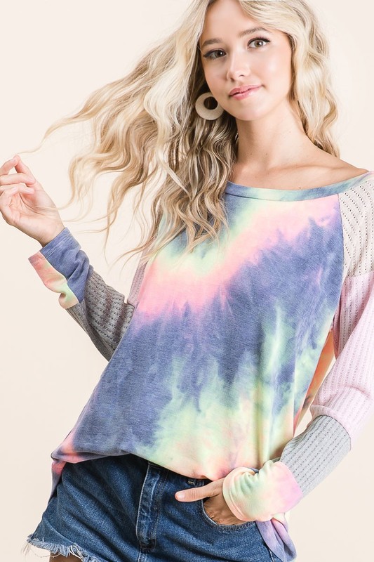 The Tie Dye Terry Top With Color Block Pointelle Knit is a chic and unique piece that combines tie-dye with color blocking and pointelle knit details. The terry fabric provides a comfortable feel, while the color block and pointelle knit add texture and visual interest to the top. This top is a trendy and eye-catching choice for adding a pop of style to your wardrobe.