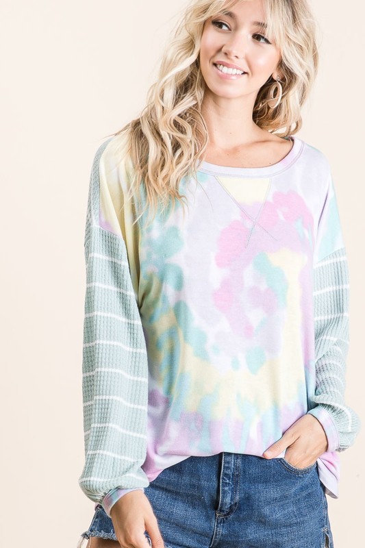 This tie dye terry top with a wide stripe thermal waffle is a unique and versatile piece for your wardrobe. The combination of tie dye and wide stripes creates a bold and eye-catching design. The terry fabric adds a soft and cozy texture to the top, perfect for comfortable wear. The thermal waffle detailing provides warmth and adds a modern twist to the look. This top is a stylish choice for adding a pop of color and texture to your outfit.