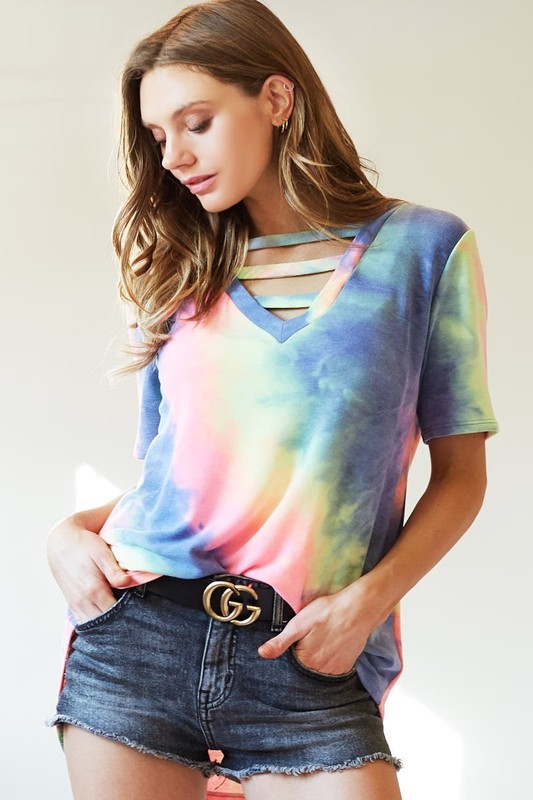 The Tie Dye Terry V-neck Top with Strapped Front Neck is a trendy and unique piece for your wardrobe. The tie-dye print adds a fun and vibrant touch to the soft terry fabric. The V-neckline is flattering and versatile for various body types. The strapped front neck detail adds a stylish and edgy element to the top. Ideal for a casual day out or a summer gathering, this top can be paired with shorts or jeans for a cool and fashionable look.