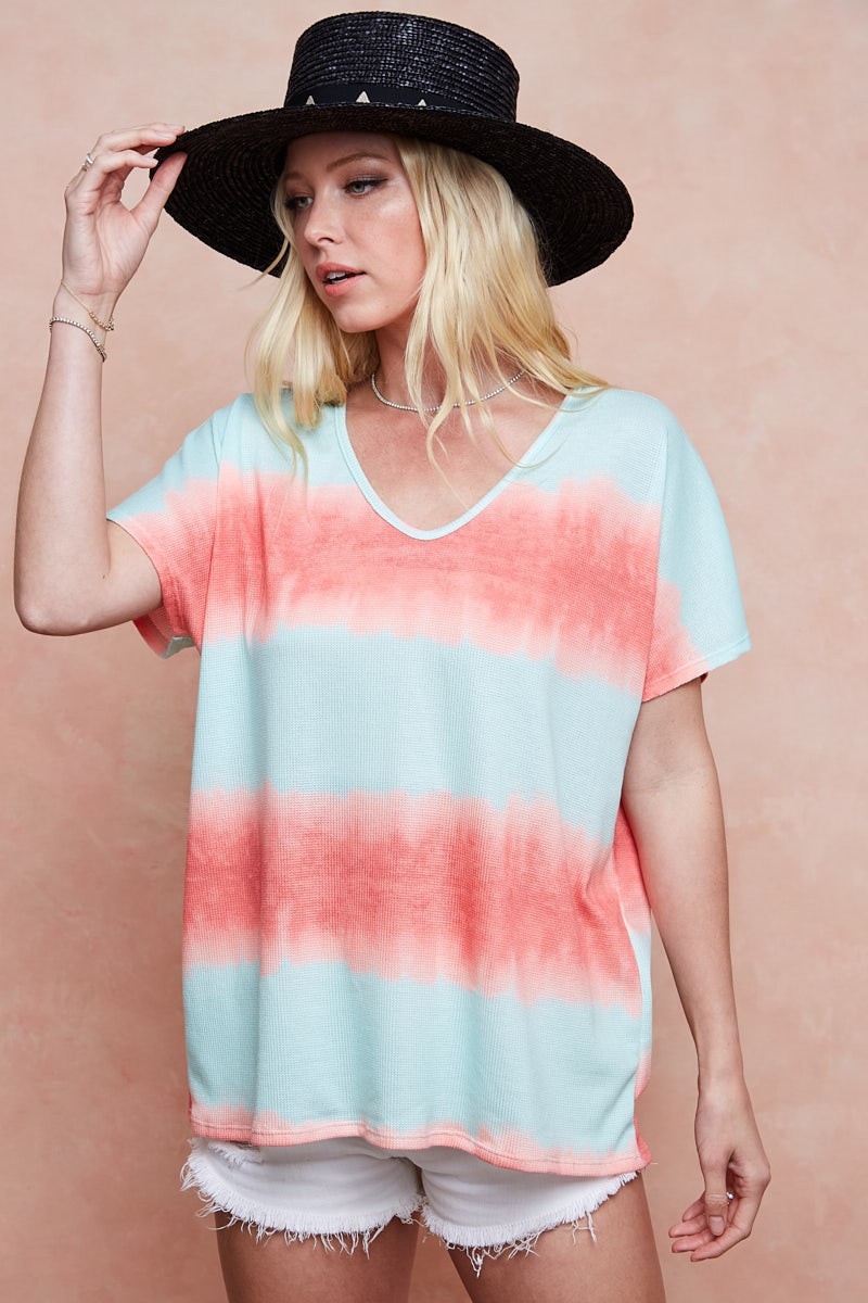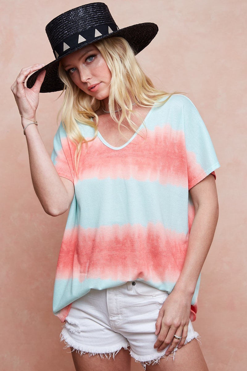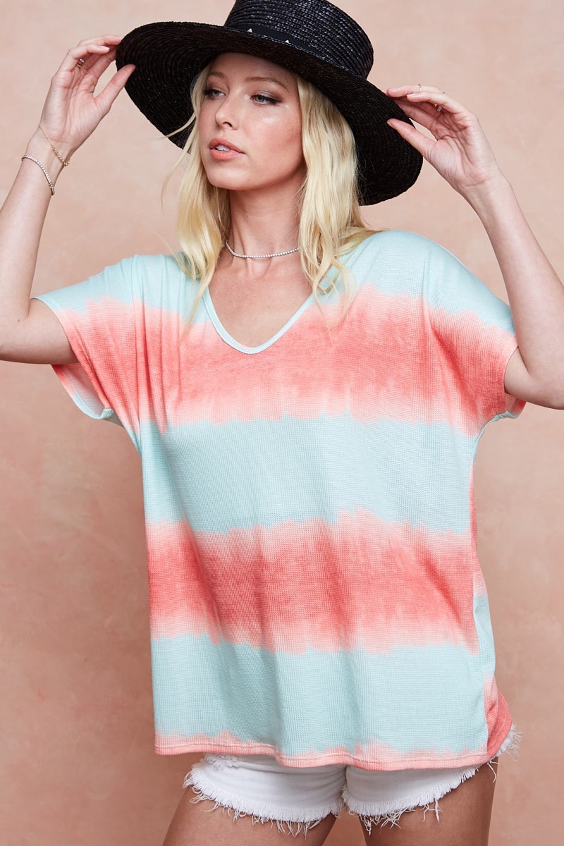 The tie-dye printed Hacci knit top is a fun and vibrant addition to your wardrobe. The tie-dye print adds a playful and colorful touch to this cozy Hacci knit top. Perfect for adding a pop of personality to your outfit, this top is ideal for casual and laid-back styling. Pair it with your favorite jeans or leggings for a relaxed and stylish look. Embrace the bohemian-inspired and trendy vibe of this tie-dye printed Hacci knit top for a fashionable and eye-catching ensemble.