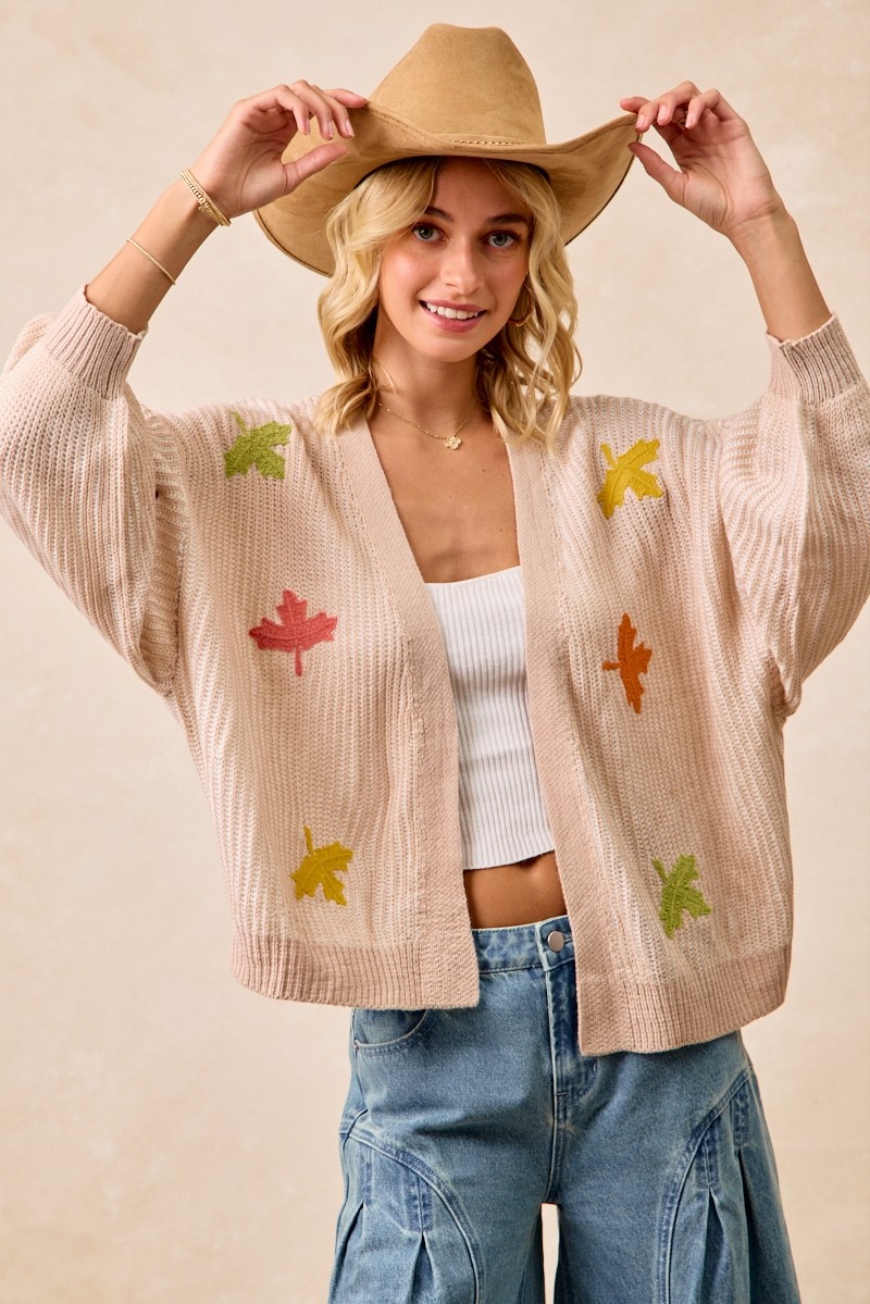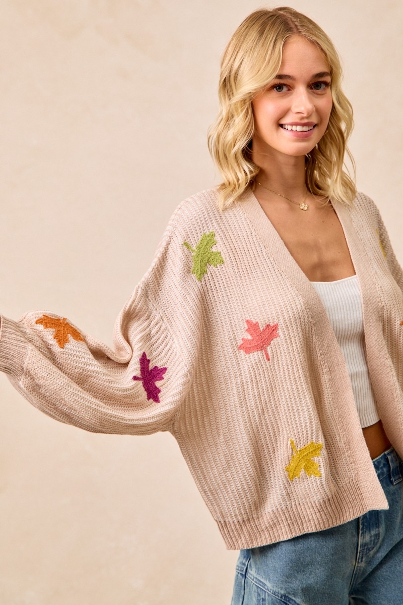 Embrace a touch of nature with this Two Tone Knit Cardigan featuring delightful leaf patches. The contrasting tones create a striking and stylish look. The leaf patches add a whimsical and organic element to the knit cardigan. Stay cozy and chic with this unique piece perfect for layering. Elevate your style with this trendy cardigan adorned with charming leaf details.