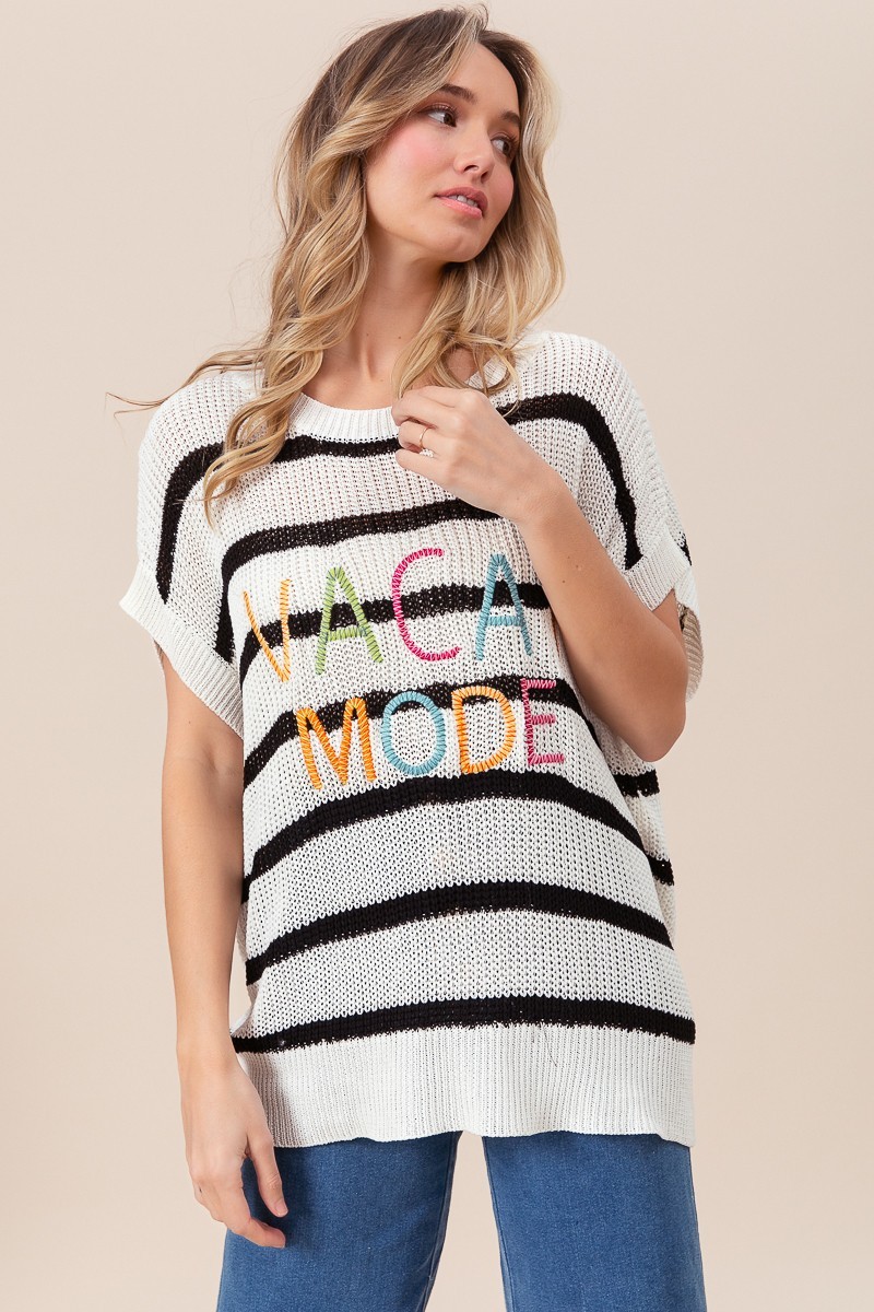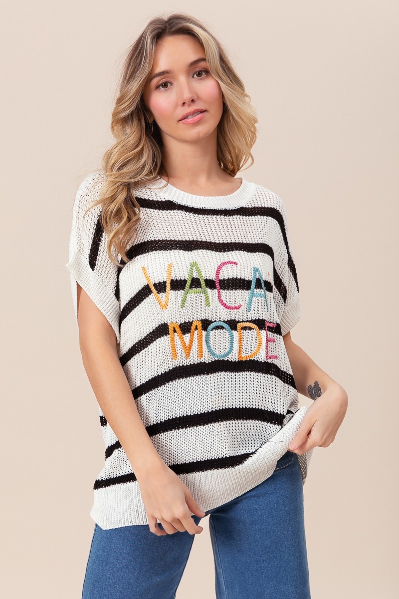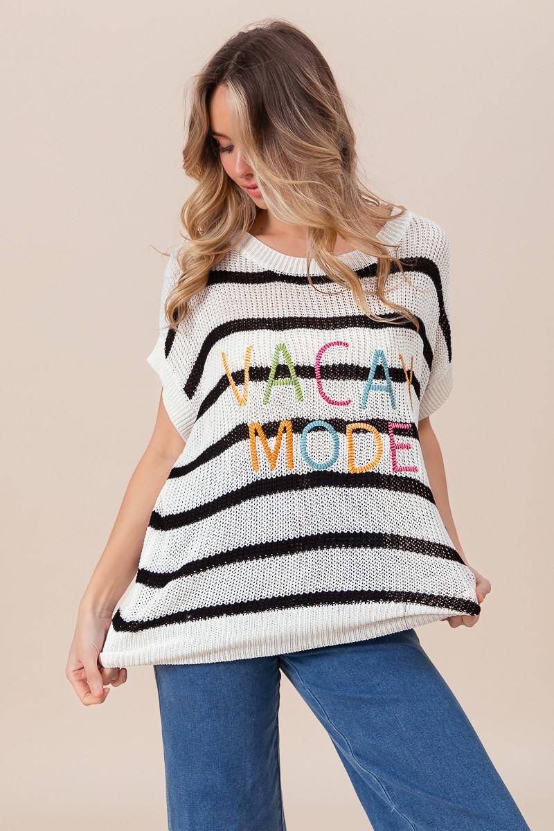 Get ready for vacation mode with this lettering drop shoulder striped sweater. The stylish design is perfect for a relaxed getaway. With a comfortable drop shoulder silhouette, this sweater is ideal for casual and laid-back days. Pair it with shorts or leggings for a chic and effortless vacation look.
