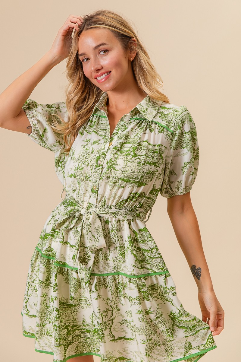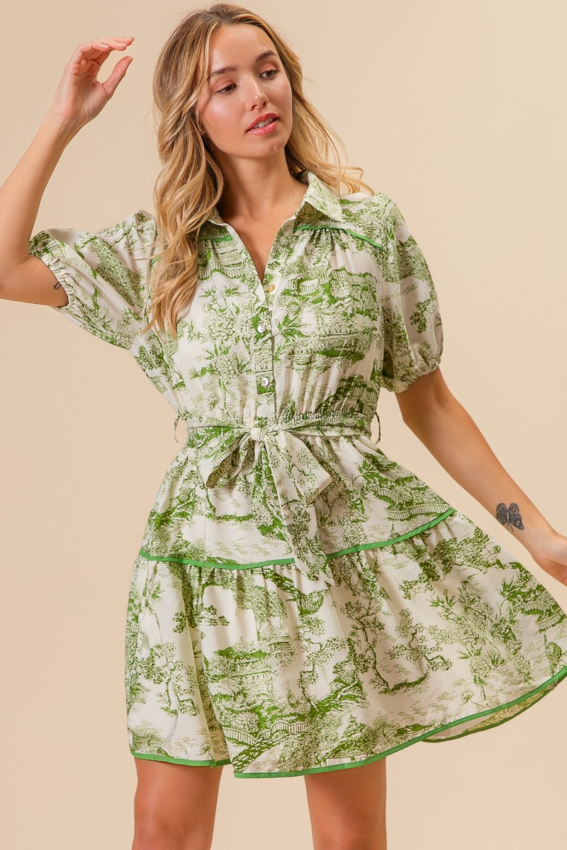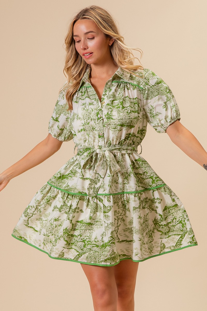 - Features: Buttoned, Tiered, Belted, Pocketed