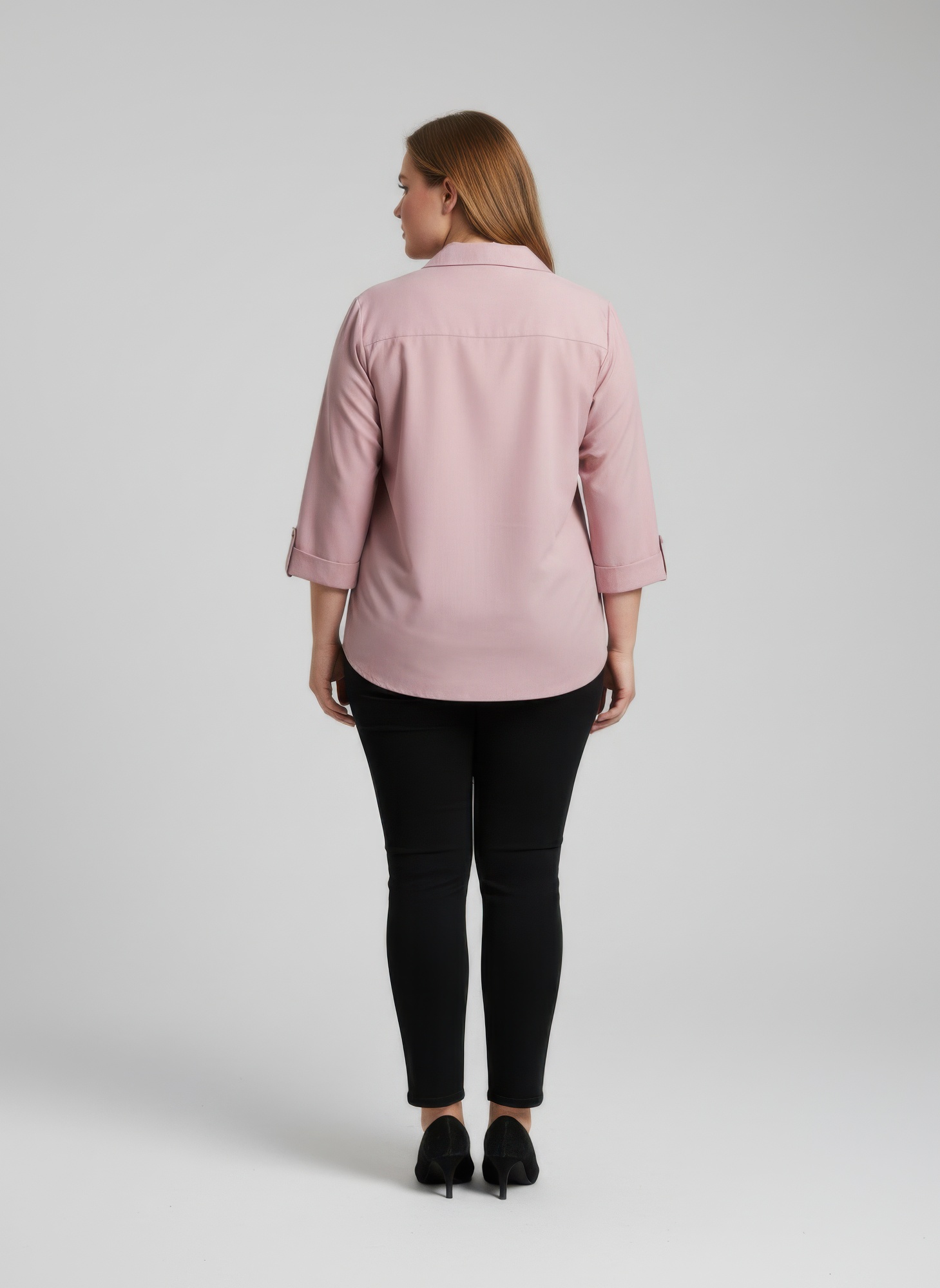 The Blush Utility Button Front Roll Sleeve Blouse blends relaxed sophistication with practical detailing for a polished everyday look. Designed in a soft blush pink tone, this versatile blouse features a structured collar and partial button front that creates a clean and refined silhouette. The lightweight fabric drapes smoothly over the body, offering a comfortable fit that transitions effortlessly from work to casual settings. Two front chest pockets add a functional utility inspired detail, while subtle metallic buttons provide a modern accent. The sleeves can be worn rolled and secured with button tabs for a relaxed feel or left down for a more classic appearance. With its curved hem and easy fit, this blouse pairs beautifully with tailored pants, denim, or skirts for a timeless and effortless style.