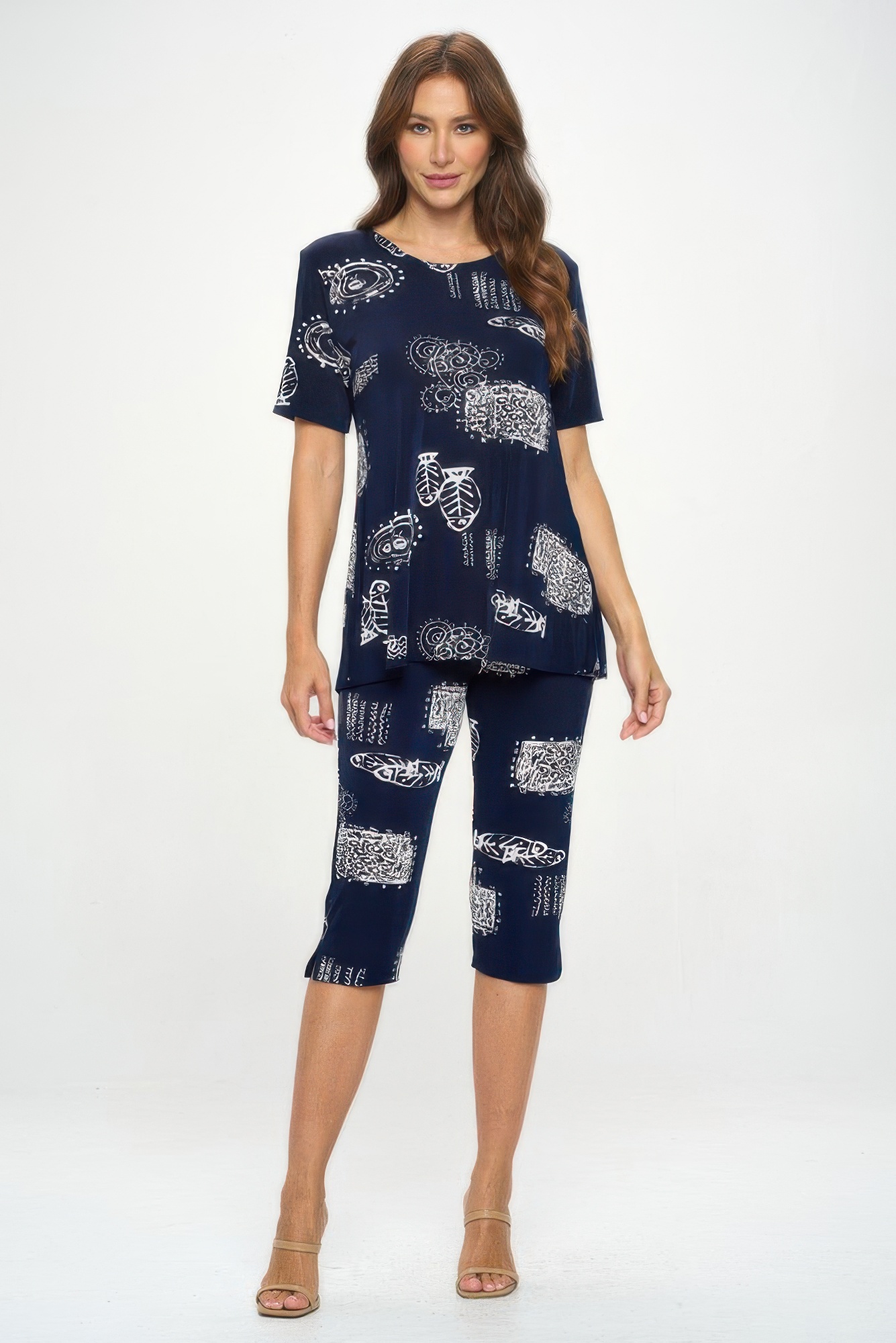 Designed for comfort and coordinated style, this two-piece set includes a printed short sleeve top and matching capri pants. The breathable fabric blend ensures softness and flexibility, while the elastic waistband provides a secure and comfortable fit. Side vents on the top allow for easy movement and all-day wear. Whether at home or on the go, this wrinkle-resistant set is perfect for travel and relaxed days. Made in the USA with attention to fit and finish.