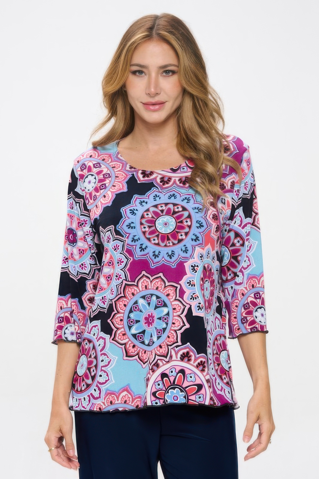Add a splash of personality to your daily lineup with the BNS Merrow Top in print. This flattering quarter-sleeve design features a round neckline and a lettuce hem that adds just the right amount of detail. Made from soft, wrinkle-free stretch fabric, it delivers breathable comfort and easy movement. Whether you’re dressing for work or weekend, this top keeps your look fresh and effortless.