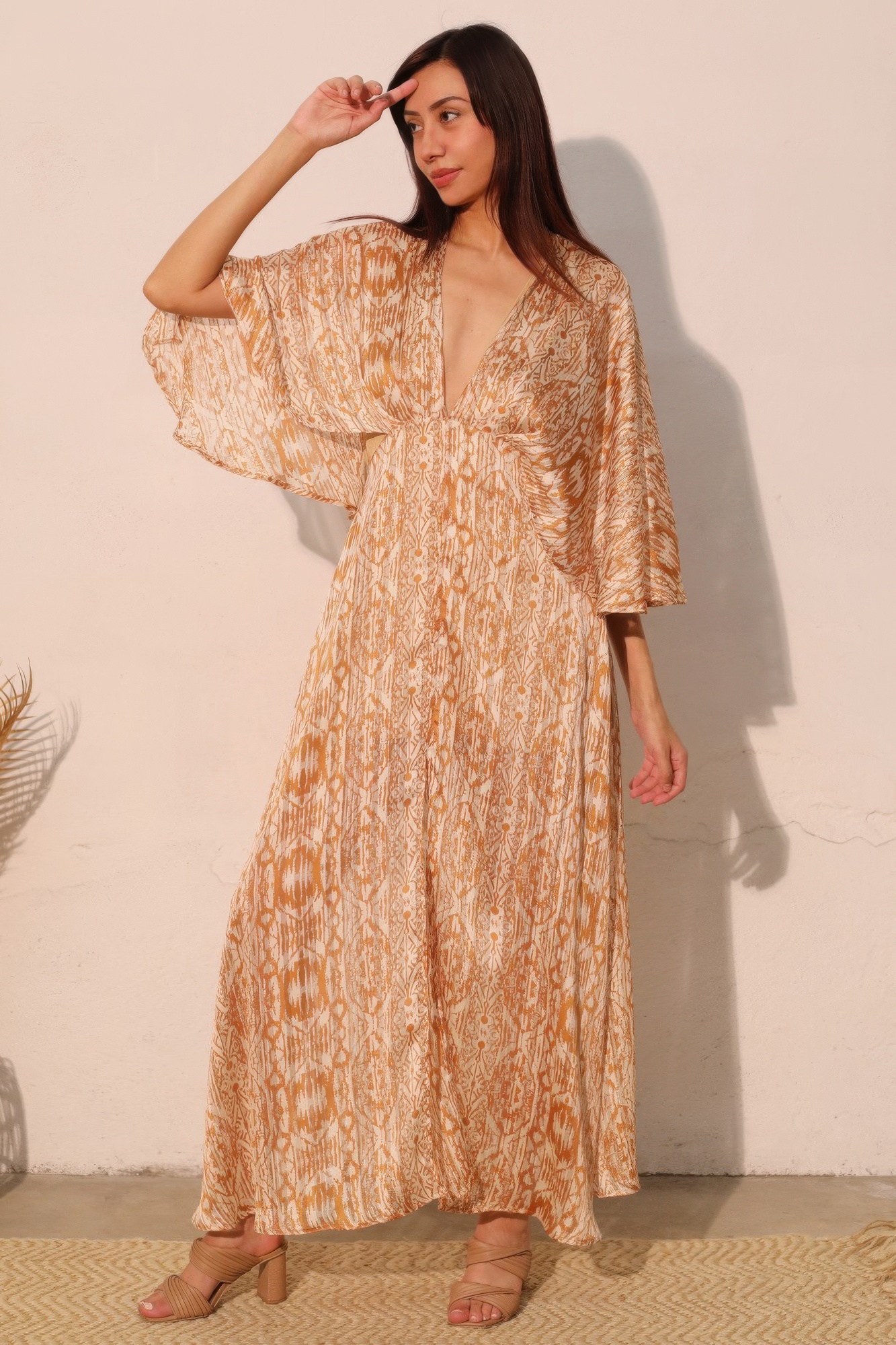 Ethereal and eye-catching, the Bohemian Lurex Chiffon Cape Maxi Dress is designed to captivate. Crafted from lightweight chiffon woven with subtle metallic lurex threads, this dress shimmers with every movement. The flowing cape-style overlay adds graceful drama, creating a silhouette that moves effortlessly from special occasions to elegant evenings away. Made in the U.S.A., it offers a perfect blend of bohemian spirit and refined glamour. Whether you're attending a celebration or escaping for a sunset dinner, this dress brings effortless beauty to the moment.