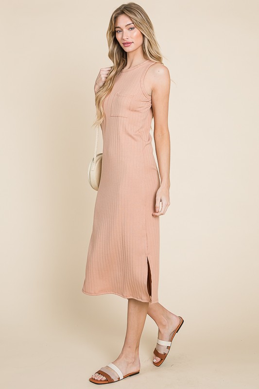 A ribbed knit sleeveless midi dress is a versatile and stylish clothing item that can be worn for various occasions. The ribbed knit fabric adds texture and dimension to the dress, while the sleeveless style makes it perfect for the warmer months. The midi length strikes a balance between being chic and comfortable. This dress can be dressed up with heels and statement jewelry for a more formal look, or dressed down with sandals or sneakers for a more casual vibe. It's a great addition to any wardrobe for a polished and effortless outfit option.