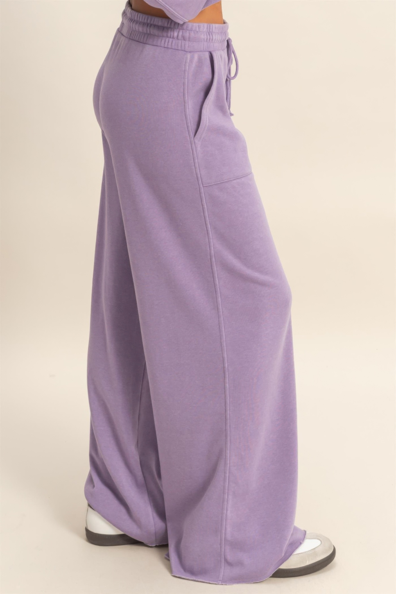 These burnout French terry wide-leg pants offer a bold yet comfortable take on everyday loungewear. Crafted from soft burnout washed fabric, they deliver a lightweight feel with subtle texture and depth. The high-rise elastic waistband creates a flattering fit, while the functional drawstring allows for adjustable comfort. An oversized wide-leg silhouette adds dramatic movement and a contemporary edge. Prominent front-facing patch pockets enhance both style and practicality. Pair them with a cropped sweatshirt and chunky sneakers for a cozy, fashion-forward ensemble.
