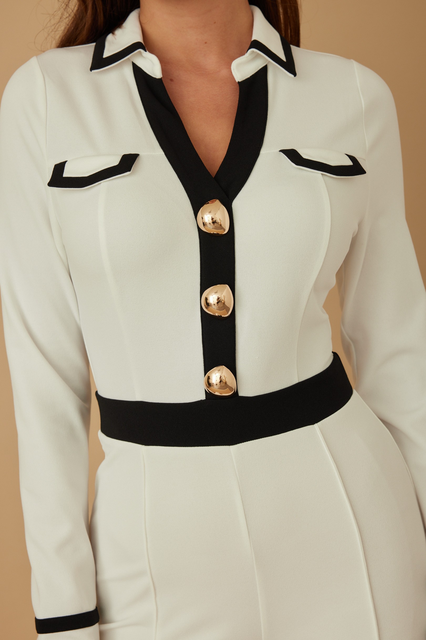 The Button Trio Jumpsuit delivers timeless tailoring with a touch of luxe detail. Designed with a structured collar and long sleeves, this sleek piece features a trio of gold ball buttons at the front for a polished focal point. Chest flap accents and patterned sleeve cuffs add subtle contrast and elevated interest. Crafted from a smooth, stretch-blend fabric, it offers a flattering fit that moves with you. Finished with a back zipper for clean lines, this jumpsuit is ideal for work-to-evening transitions or any occasion that calls for sophisticated style.
