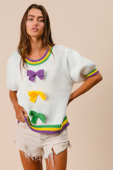 Choose Options BiBi Short Puff Sleeve Ribbon Bow Mardi Gras Sweater MSRP: Was: Now: $49.07 The Short Puff Sleeve Ribbon Bow Mardi Gras Sweater is a festive and stylish piece perfect for celeb…