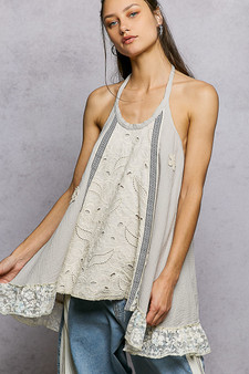 Choose Options POL Lace Ruffle Halter Neck Double Gauze Top with Crochet Patch MSRP: Was: Now: $65.41 This halter neck sleeveless top is designed in a regular fit and made from double gauze fabric for a…