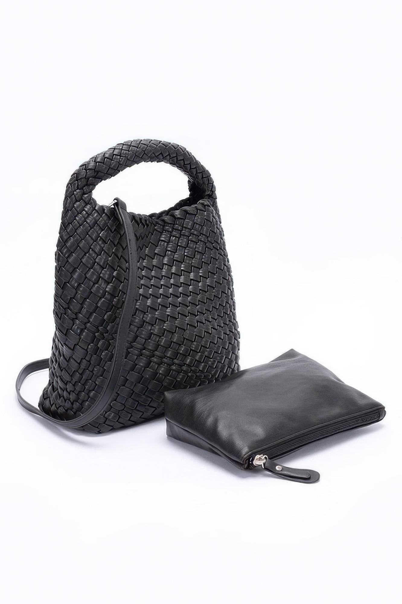Includes both a woven handbag and a matching clutch