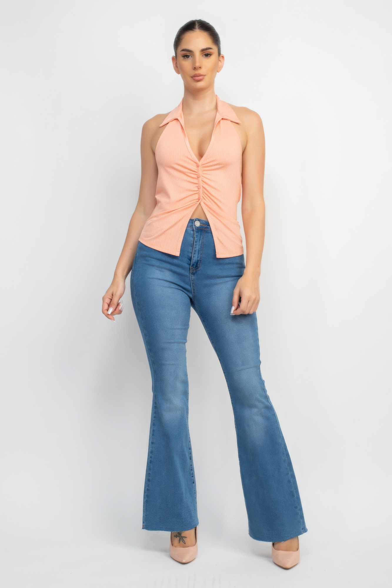 A knit chic top in solid color featuring a collared halter neckline, front button-down, ruched design, open-back, and a waist length.