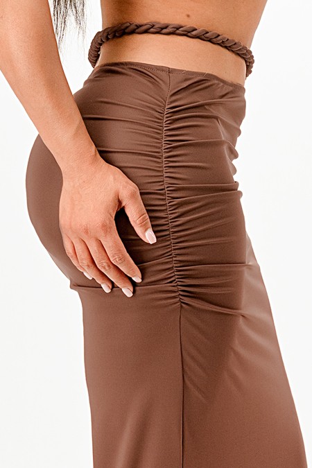 Turn heads with the striking silhouette of this cord top and skirt set, designed to make a bold yet elegant impression. The ruched, asymmetrical top features a bandage-inspired design that hugs the body and highlights your shape. Paired with a coordinating floor-length skirt, this set offers a sleek and sculpted look from top to bottom. Crafted from a soft, stretch-enhanced fabric, it moves with you while maintaining its form-fitting structure. Available in four captivating colors, it's perfect for evening events, special occasions, or nights out.