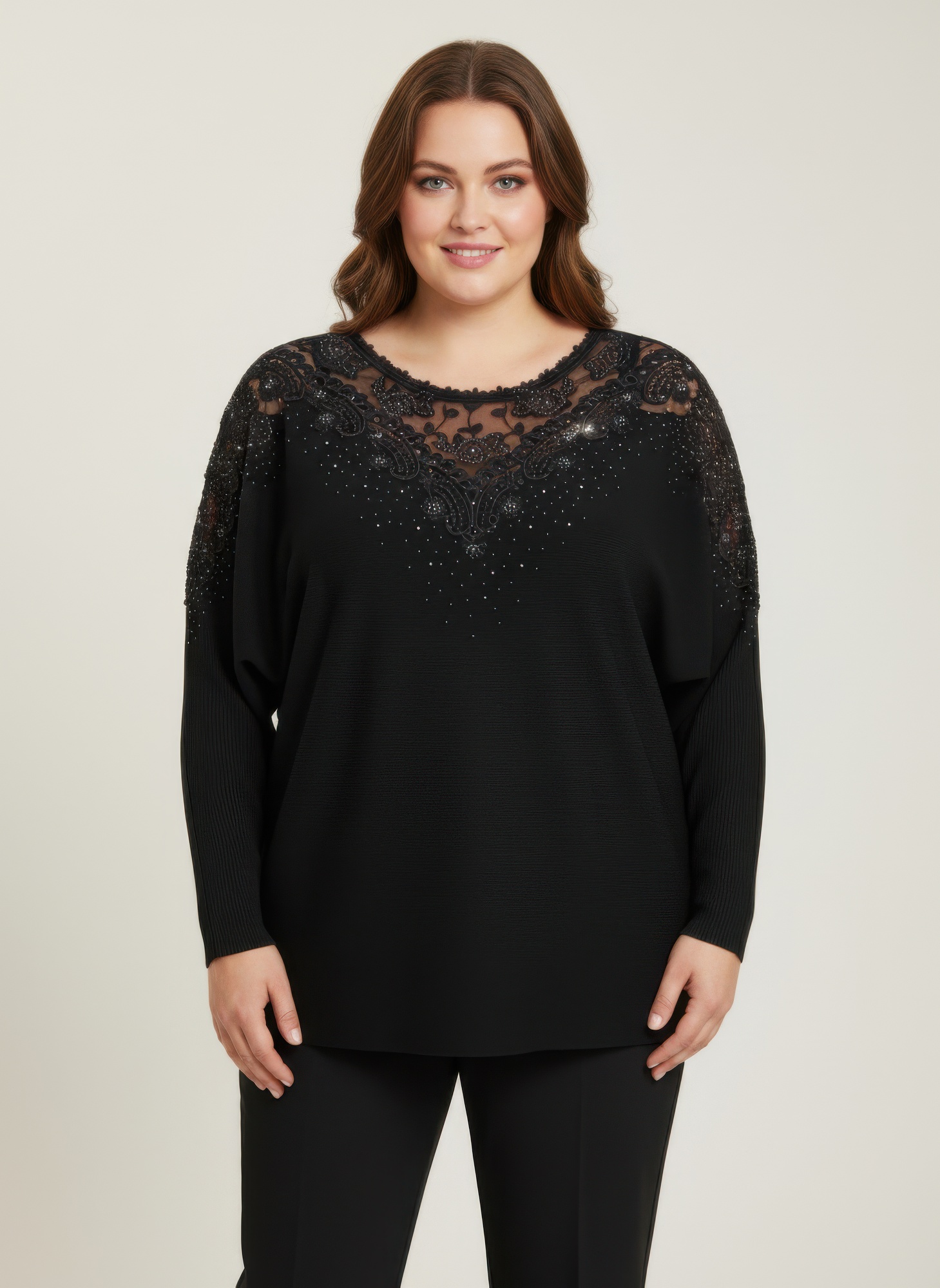 The Crimson Lace Embellished Knit Tunic Top combines graceful detailing with a bold, elegant color for a refined statement piece. Designed in a vibrant crimson red shade, this long sleeve tunic features a relaxed silhouette that drapes smoothly for both comfort and style. The soft knit fabric provides a comfortable feel while maintaining a polished appearance suitable for a variety of occasions. Intricate lace inspired embellishments adorn the neckline and upper chest, creating a beautifully detailed pattern that adds texture and subtle sparkle. The tunic length offers flattering coverage and pairs effortlessly with fitted pants or leggings. Perfect for gatherings, special occasions, or elevated everyday wear, this piece brings together sophistication, comfort, and standout style.