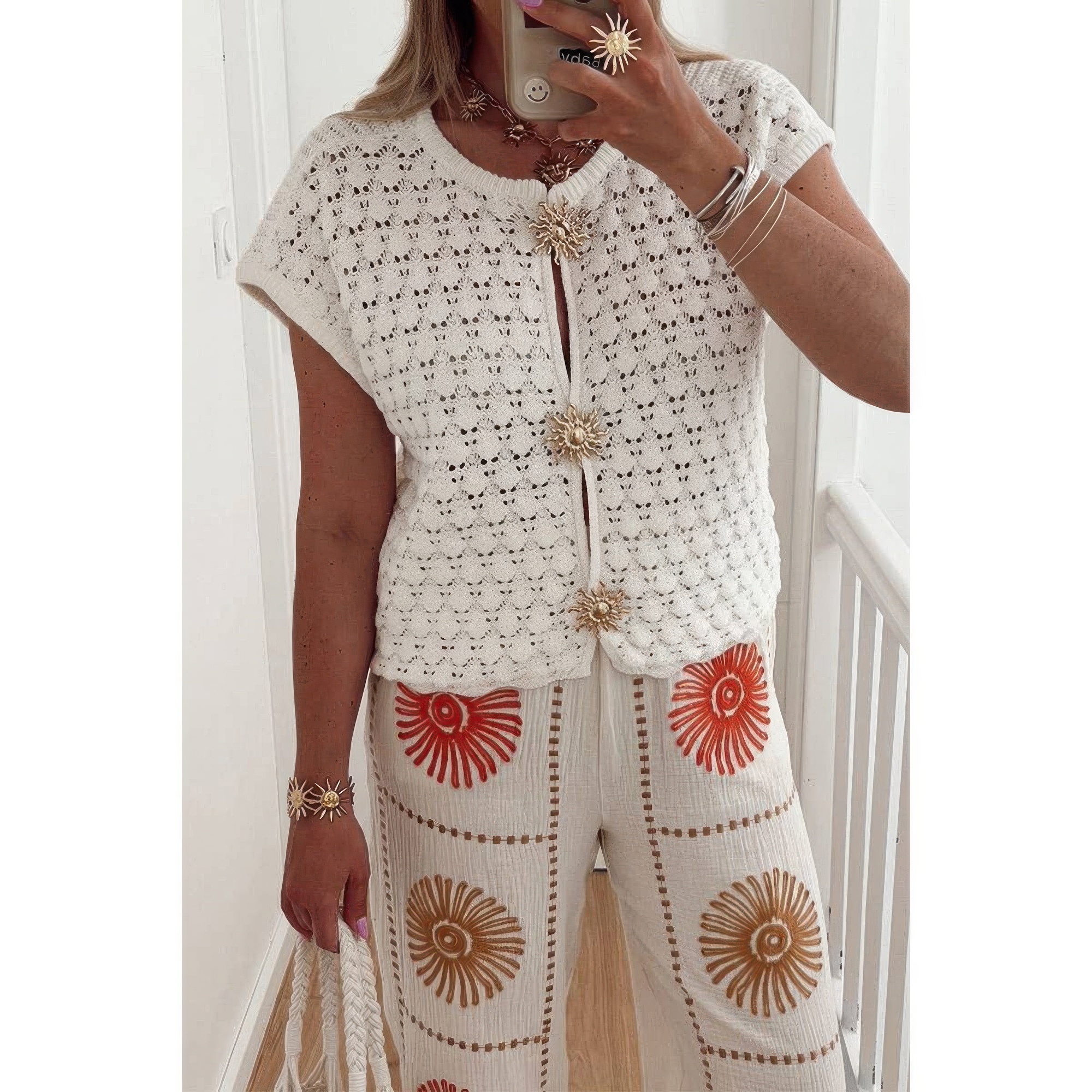 The Crochet Short Sleeve Button Front Sweater combines vintage-inspired charm with modern comfort. Made from a soft viscose-polyamide blend, it offers a lightweight, breathable feel ideal for warm days. The intricate crochet design adds texture and femininity to the classic button-front silhouette. Perfect for layering over camisoles or dresses, it transitions seamlessly from casual days to polished outings. A chic staple that complements every wardrobe.