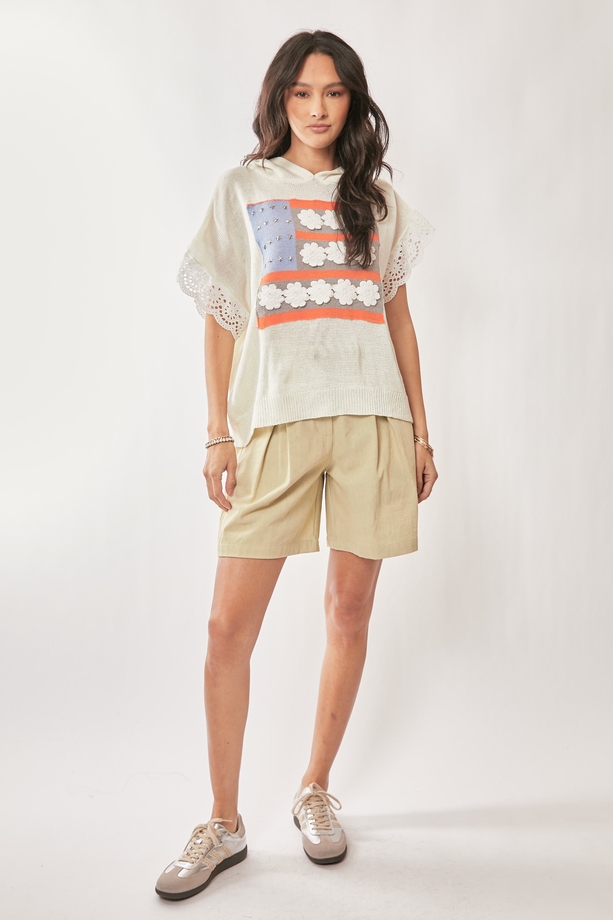 This American Flag Loose Fit Lace Sleeve Hoodie Top combines patriotic flair with trendy style. Featuring an eye-catching American flag design, this top is both festive and fashionable. The lace sleeves add a touch of glamour and femininity to the relaxed and comfy hoodie silhouette. Perfect for showing off your pride in style during any casual occasion.