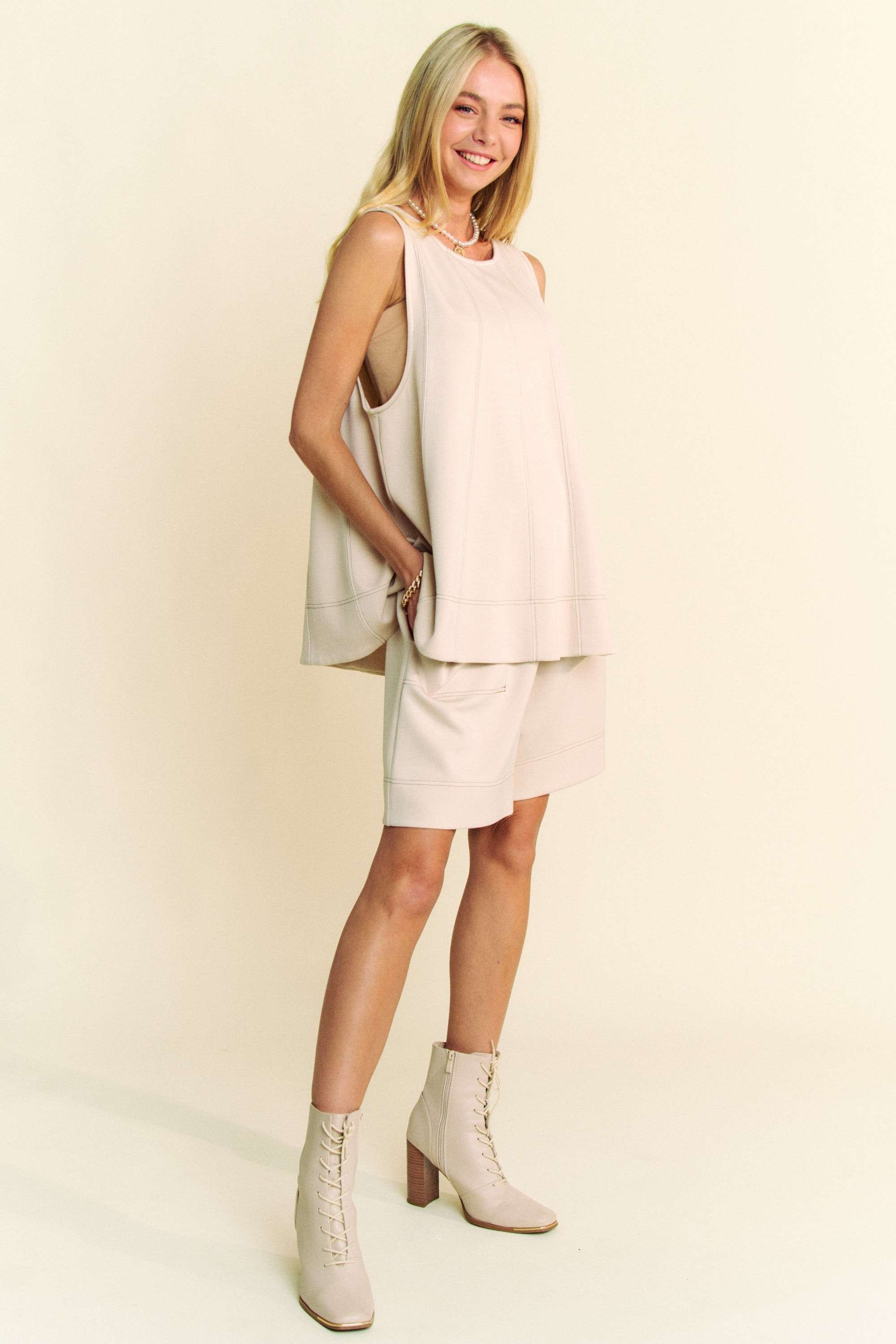 This top and short set features trendy contrast seam detailing for a modern look. The set is perfect for lounging at home or running errands in style. The comfortable fabric ensures all-day comfort, while the matching design makes it easy to put together effortless outfits. Stay chic and comfortable with this coordinated top and short set!