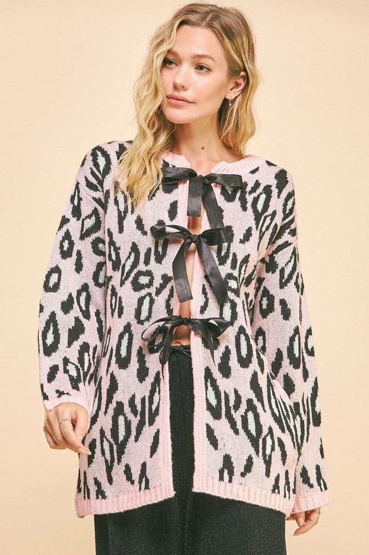 The leopard ribbon tie front loose fit cardigan features a stylish leopard print design with a feminine ribbon tie detail at the front. This cardigan offers a loose and relaxed fit, making it comfortable to wear while adding a touch of sophistication to your outfit. The ribbon tie front adds a chic and flattering element, allowing you to adjust the fit to your preference. This versatile cardigan is perfect for layering over various tops and can easily elevate your look with its trendy and eye-catching style.